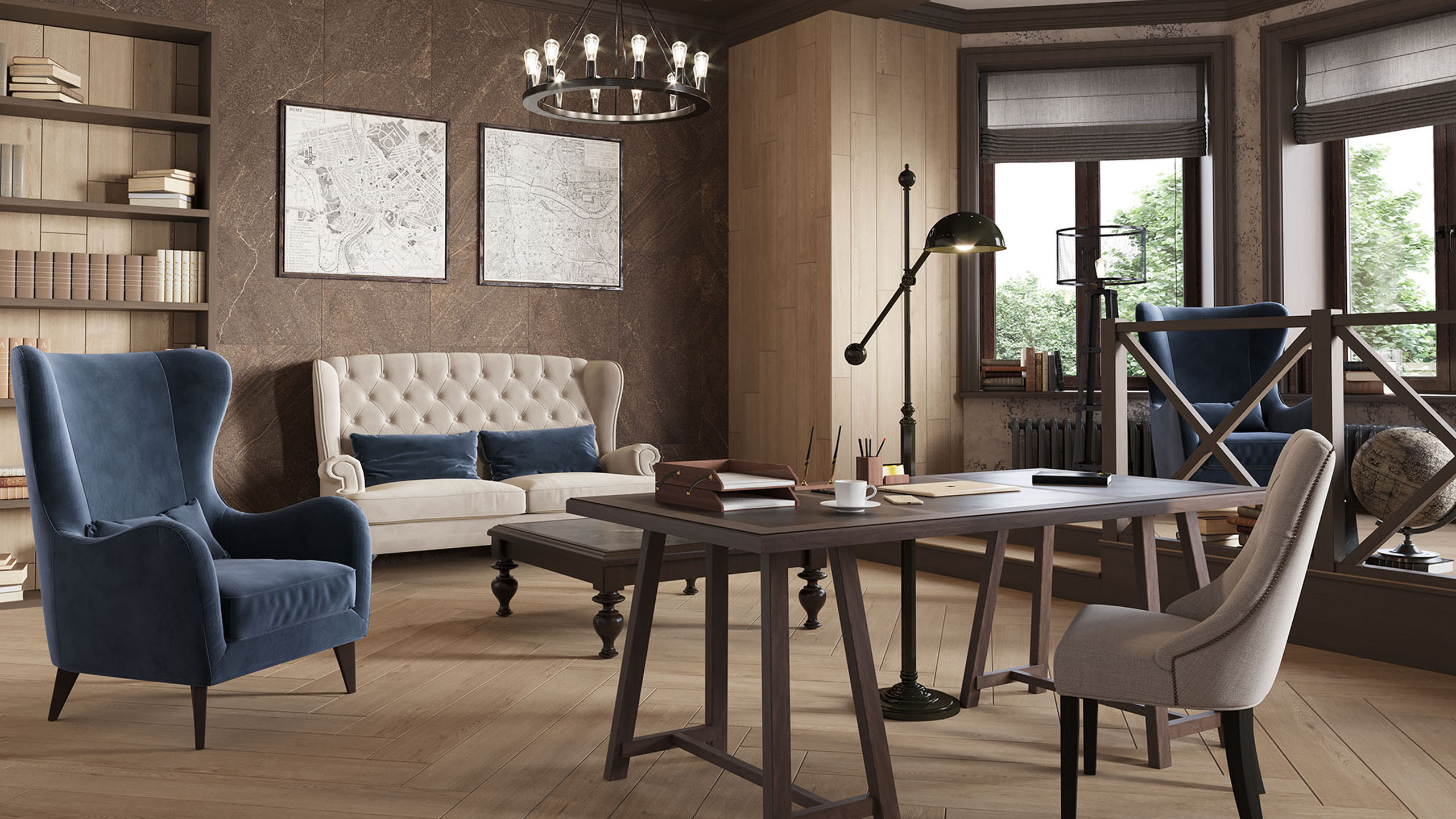 Проще всего ориентироваться на пол. Он занимает самую большую площадь и, по умолчанию, доминирует в помещении. Альтернативой могут служить стены и потолок, отделанные деревянными панелями, а также массивная корпусная мебель: встроенные шкафы, письменный стол или кровать с высоким изголовьем.