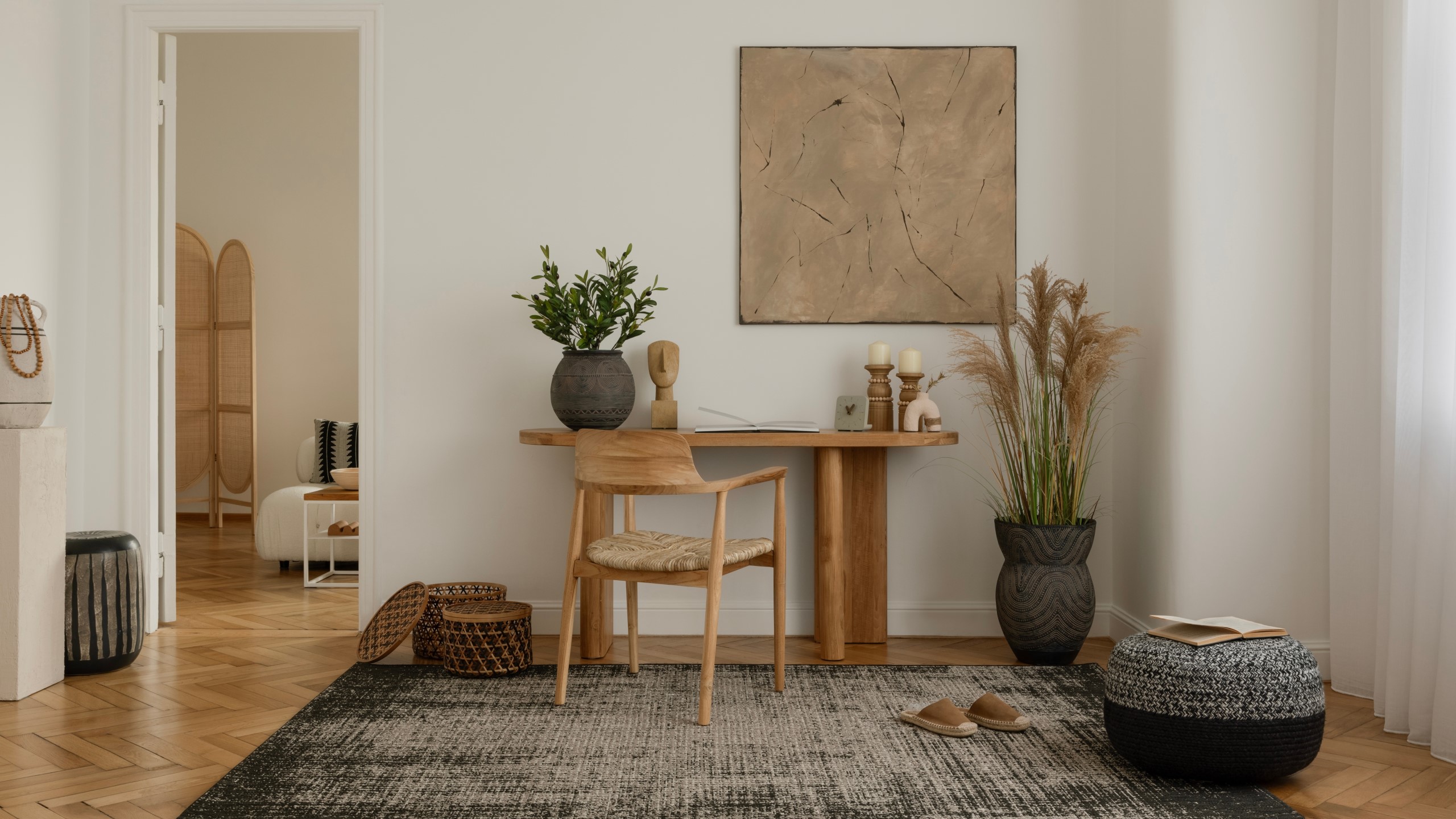 В интерьерах с визуально жестким полом (керамогранит, бетон, камень) ковры особенно эффективно работают как мягкие границы — они зонируют пространство, не разрушая целостность напольного покрытия и не нарушая архитектурный ритм.