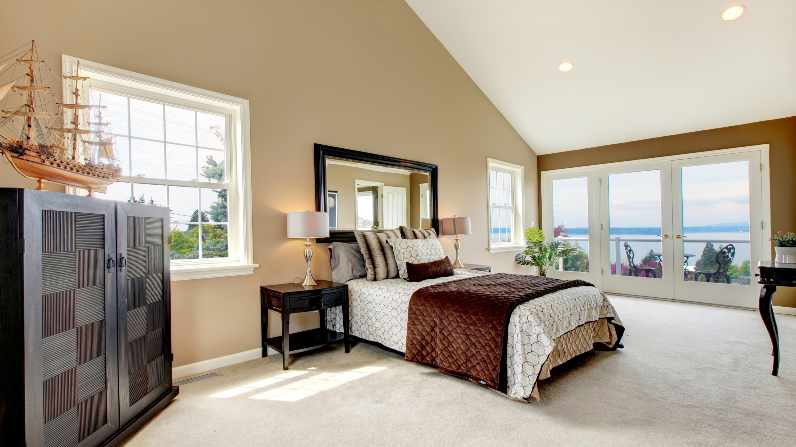 Центральный элемент американской спальни — большая и высокая двуспальная кровать. Зачастую она выполнена из массива дерева, украшена мягким изголовьем простой формы. В качестве обивки используют текстиль, хорошо смотрится каретная стяжка. Насыщенные цвета обивки могут применять в качестве акцента.