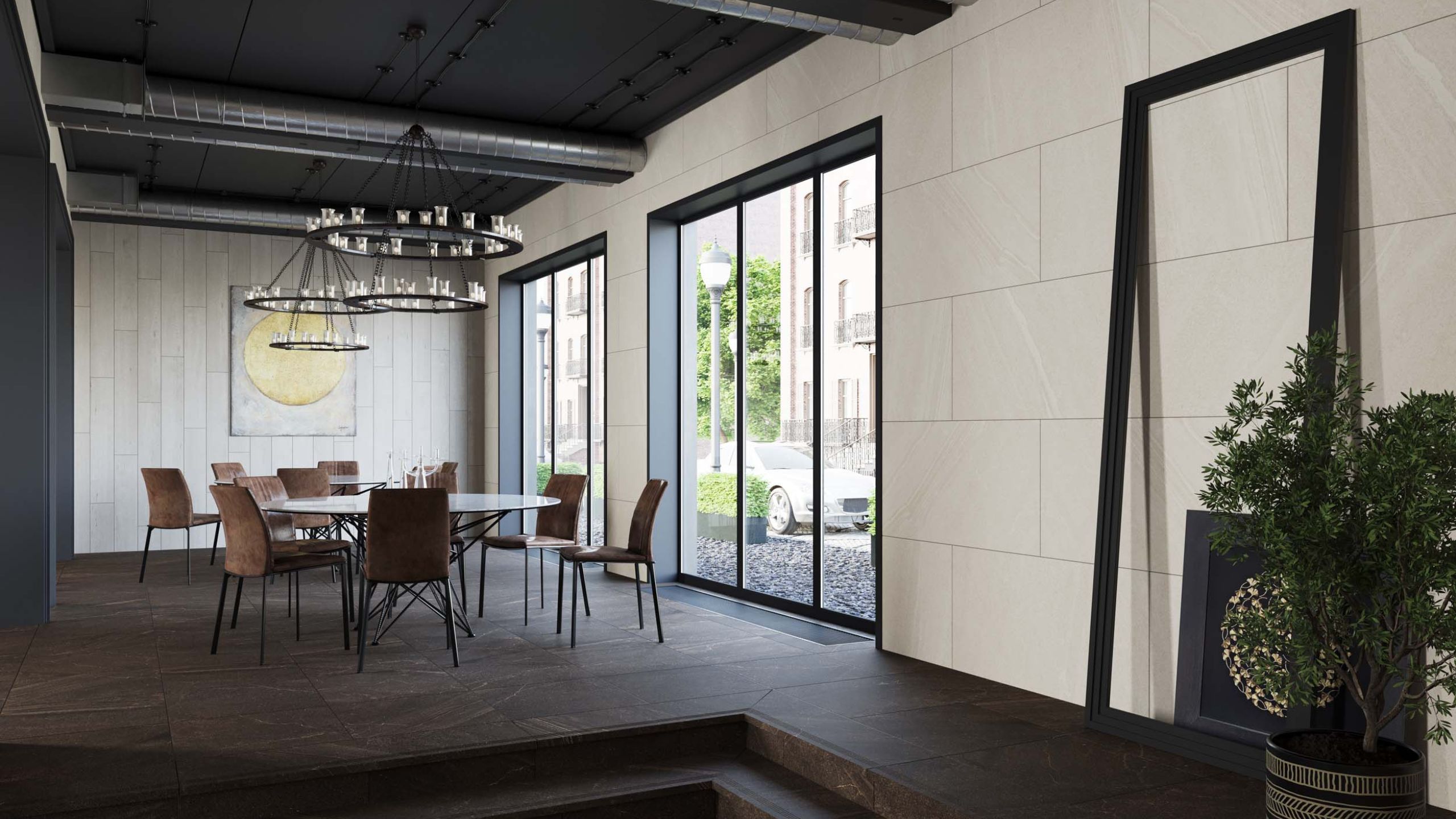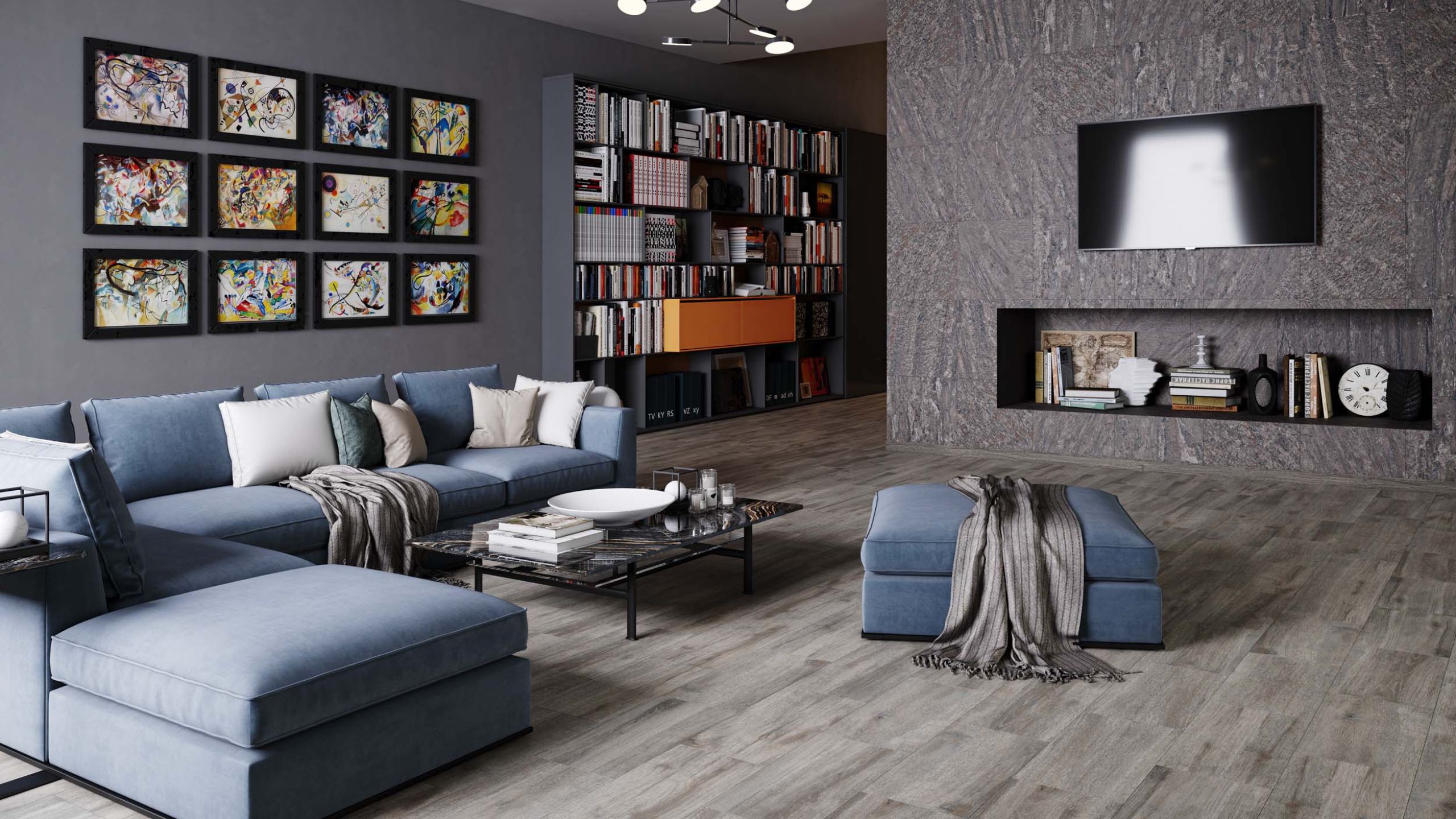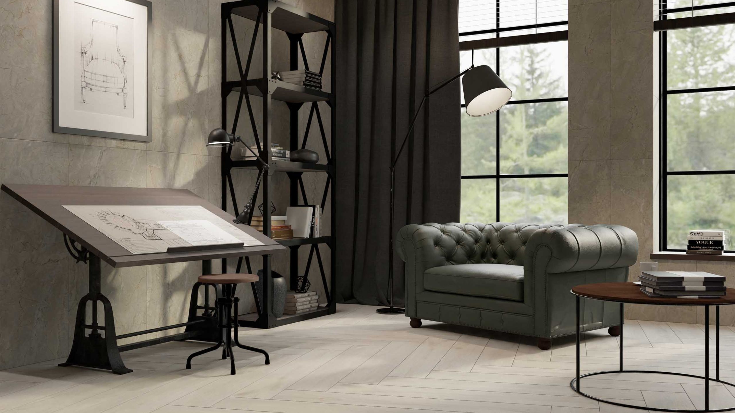 Если идти по принципу — добротная и солидная отделка, то среди всех остальных выигрывает керамогранит. Более износостойкий материал для пола вряд ли можно придумать. А еще материал может выглядеть практически как угодно. Благодаря текстуре дерева можно использовать его в английском стиле вместо традиционной древесины, например. У керамогранитной плитки может быть также текстура мрамора или камня. Например, Kailas, Marmulla, Rock.