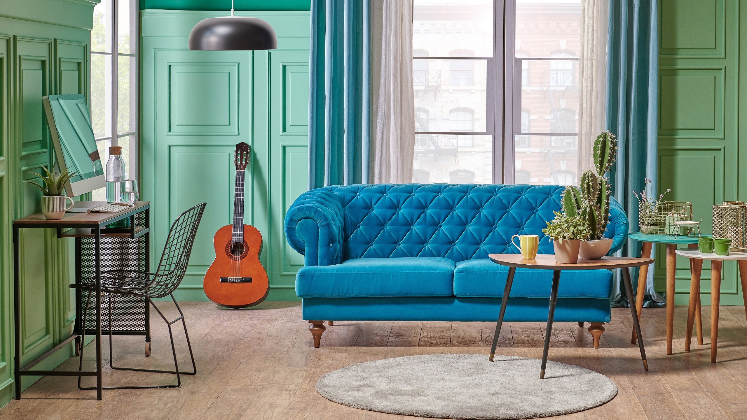 Светлый аквамарин — мягкий и освежающий оттенок, который отлично смотрится в помещениях с недостатком естественного света.