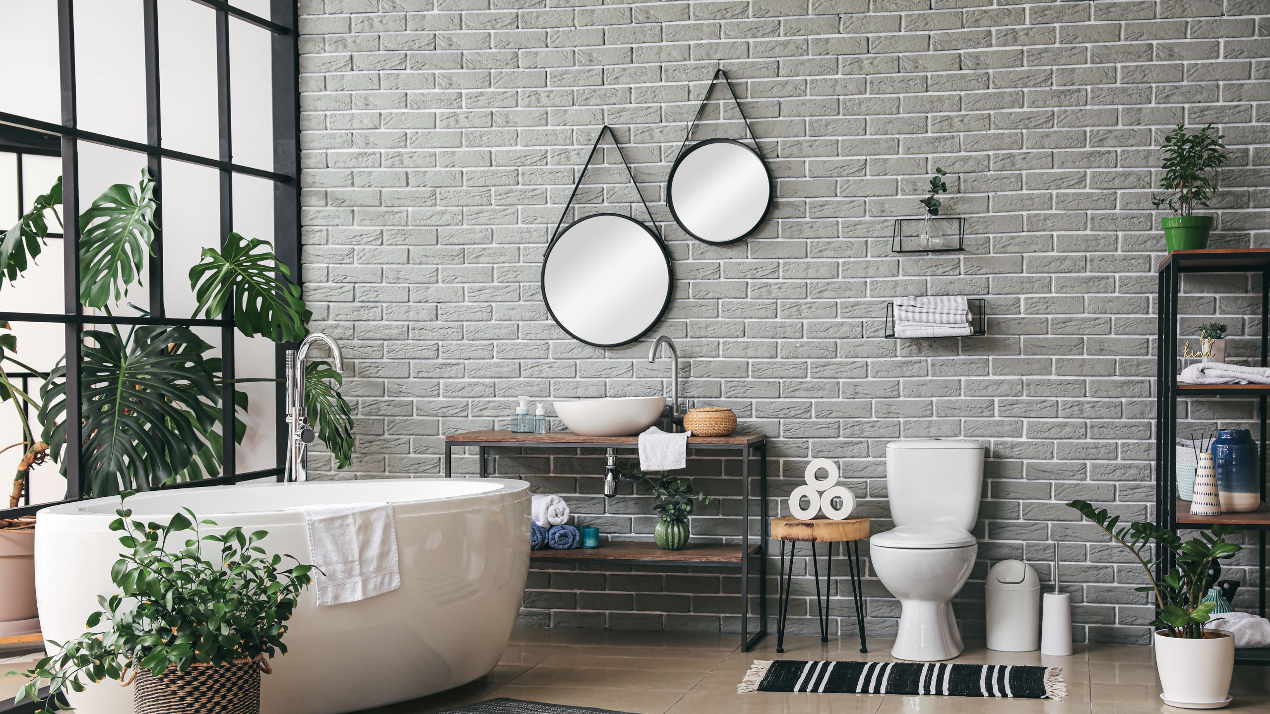 С белоснежной сантехникой хорошо сочетаются стены в черном или сером кирпиче. При этом не стоит забывать о дополнительном освещении и, например, установить на стенах светильники или бра. Еще один вариант декора — использование искусственно состаренного кирпича. Такой прием применяют при оформлении ванной комнаты в стилях прованс, шебби-шик или ретро.