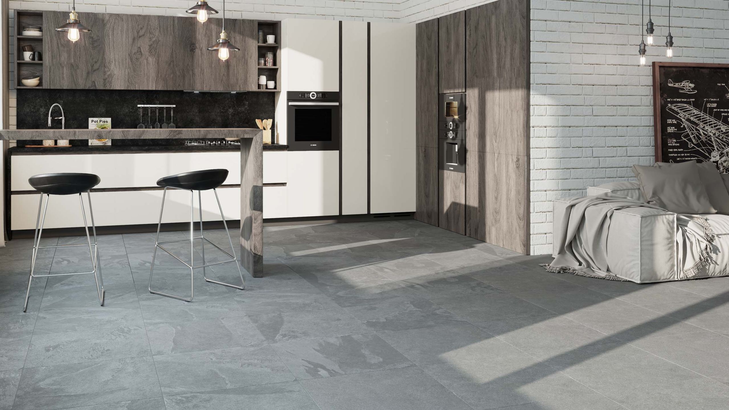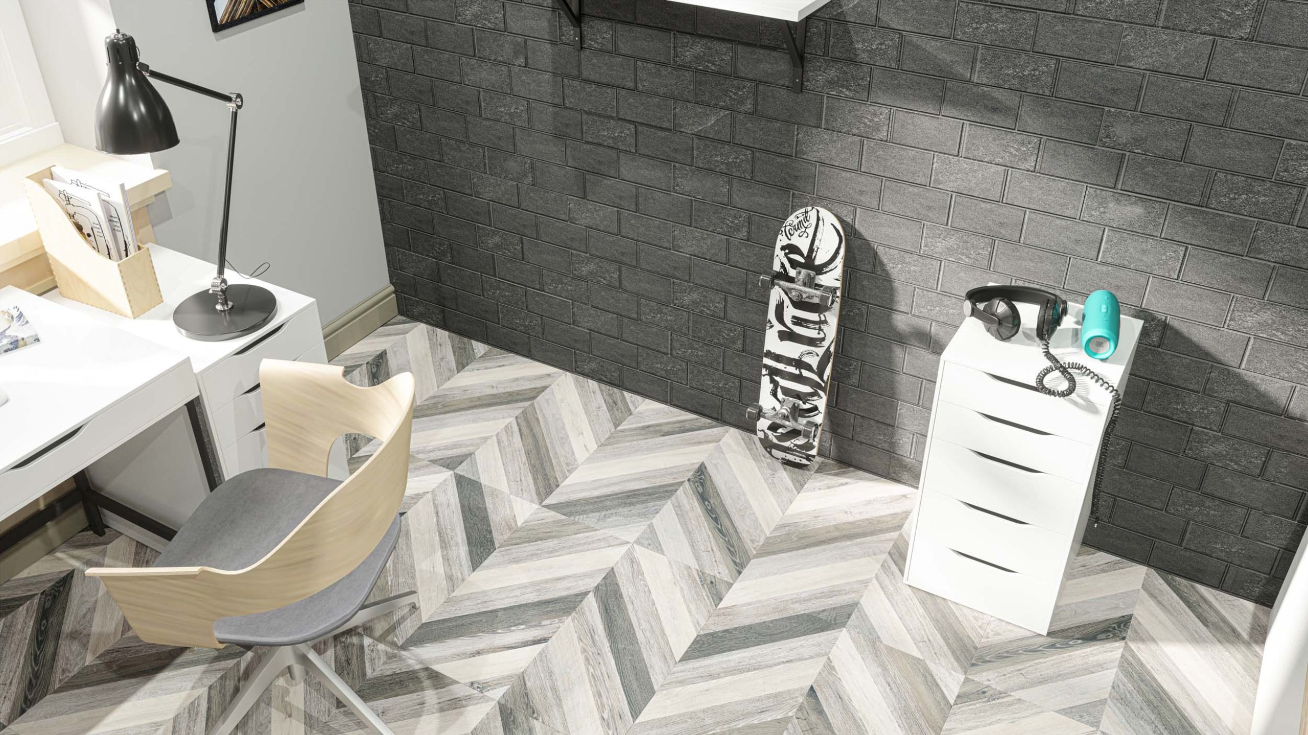 Например, если интерьер предполагает контрастный светлый пол и темные стены, можно выбрать керамогранит черного цвета. Если главный акцент в комнате сделали на темный пол, для стен лучше выбрать светлый керамогранит.