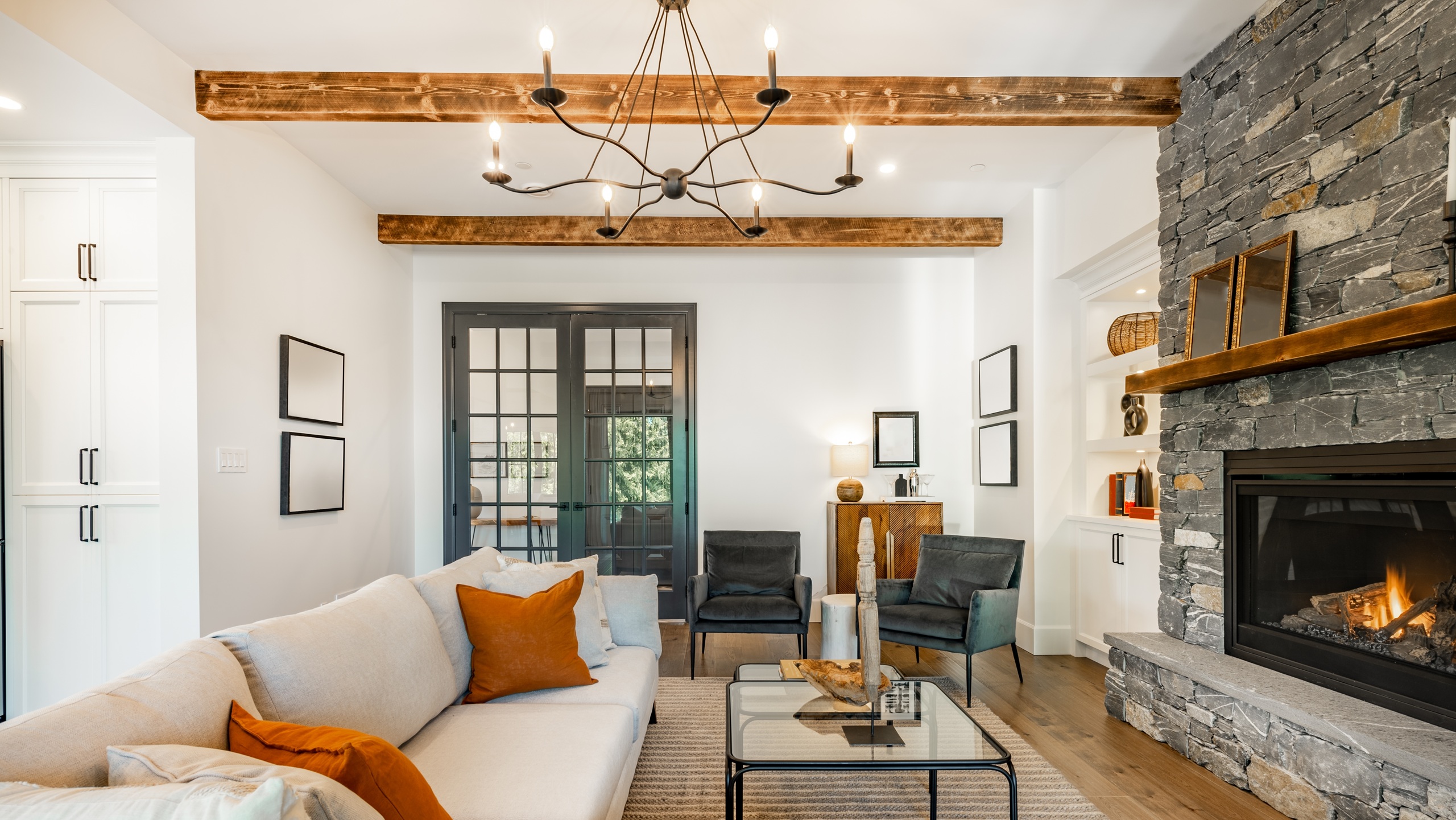 Черные балки на белом потолке добавляют выразительности и визуально вытягивают пространство.