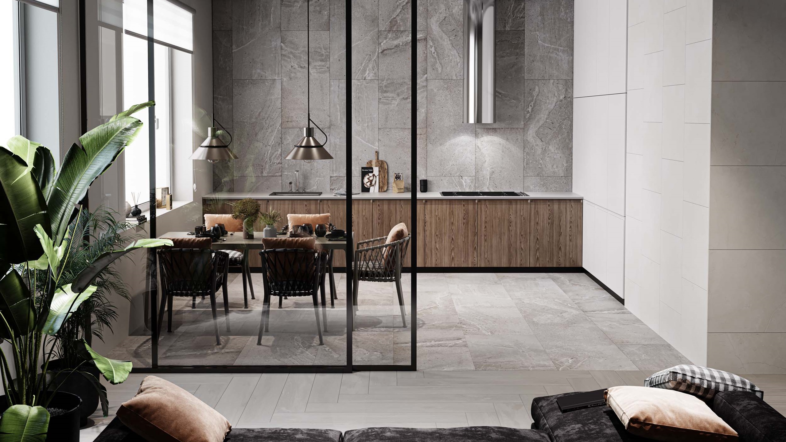 Для столовой стоит выбрать обивку для мягкой мебели, которая будет устойчивой к влаге, не будет впитывать запахи. На пол лучше уложить керамогранит: его легко чистить.