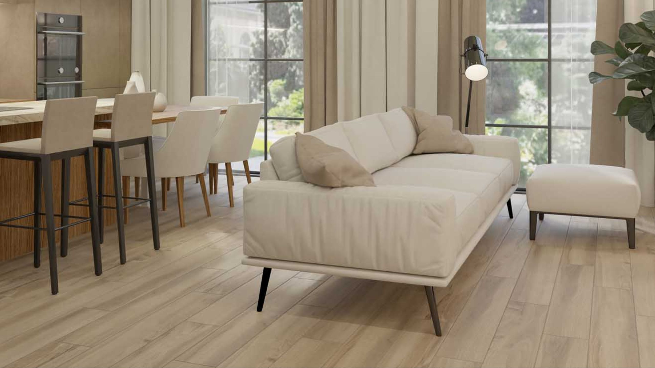 Базовые цвета для оформления помещения: кремовый, бежевый и жемчужный. От белого цвета в кухне-гостиной рекомендуют отказаться. Зато полы можно покрыть керамогранитом из коллекции Gobi.