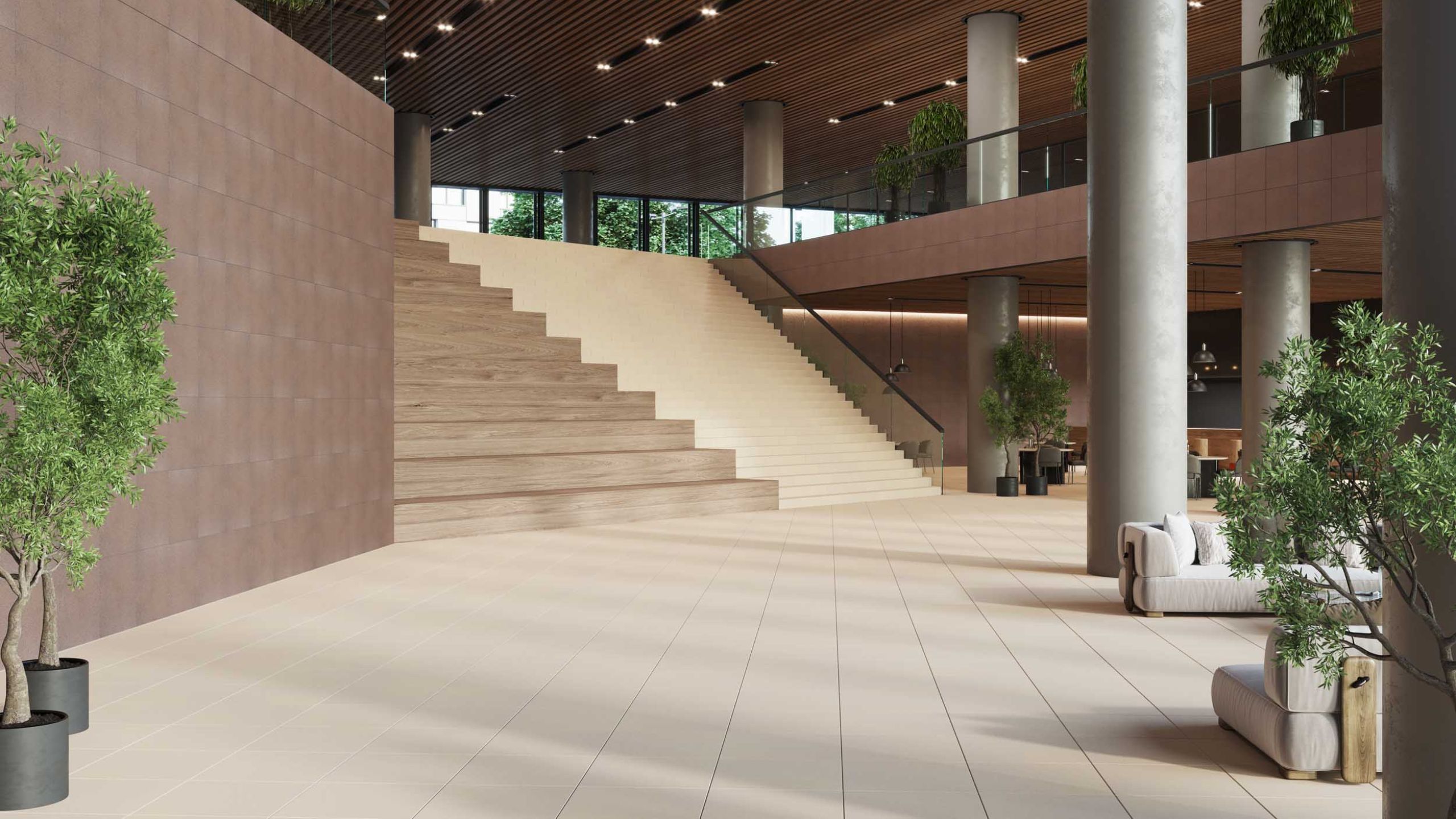 Керамогранит или керамическая плитка — удобный вариант в помещениях с высокой пропускной способностью. Благодаря гладкой поверхности, плитку легко мыть, она долговечна и стойкая к разным видам воздействий.