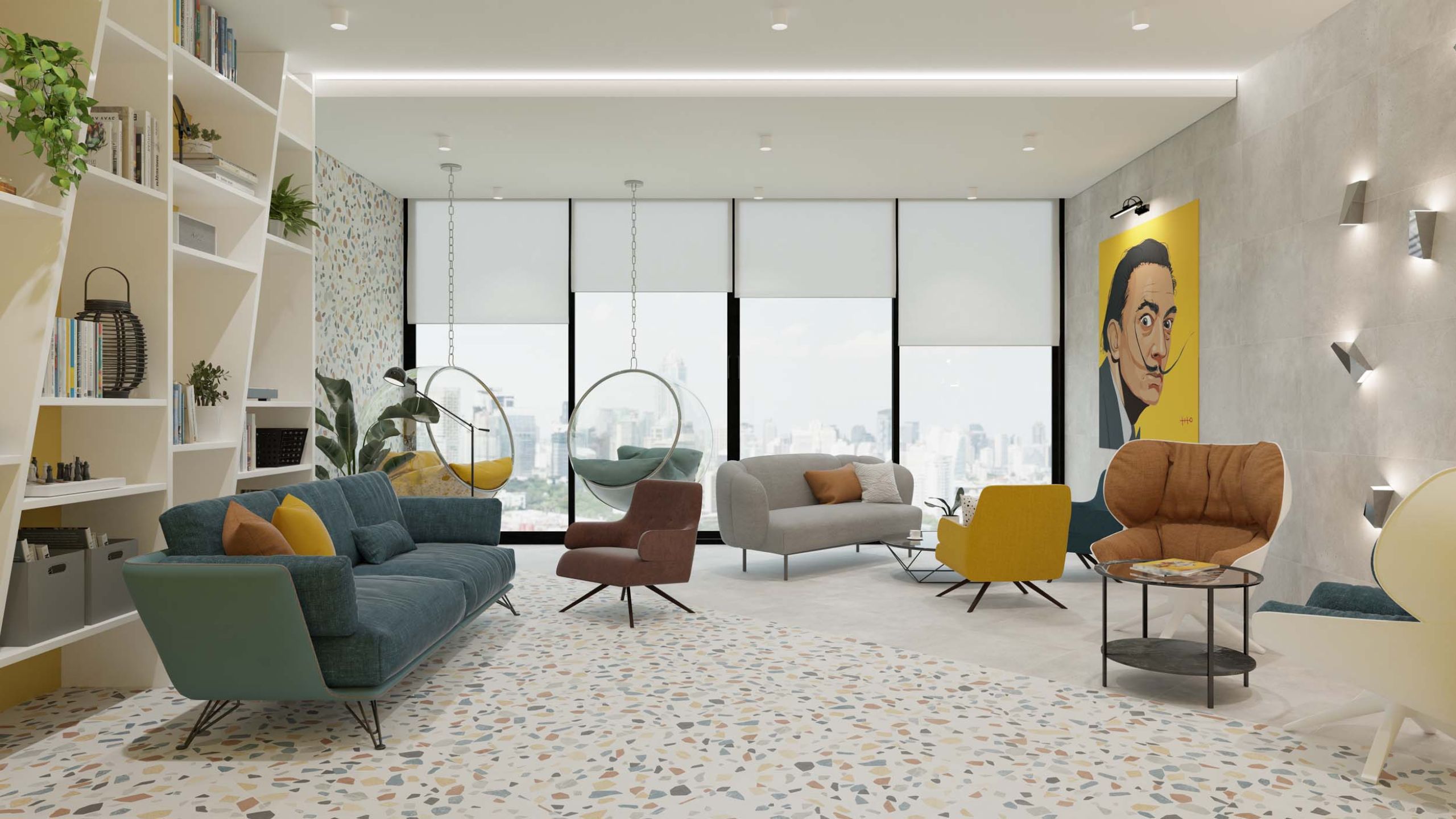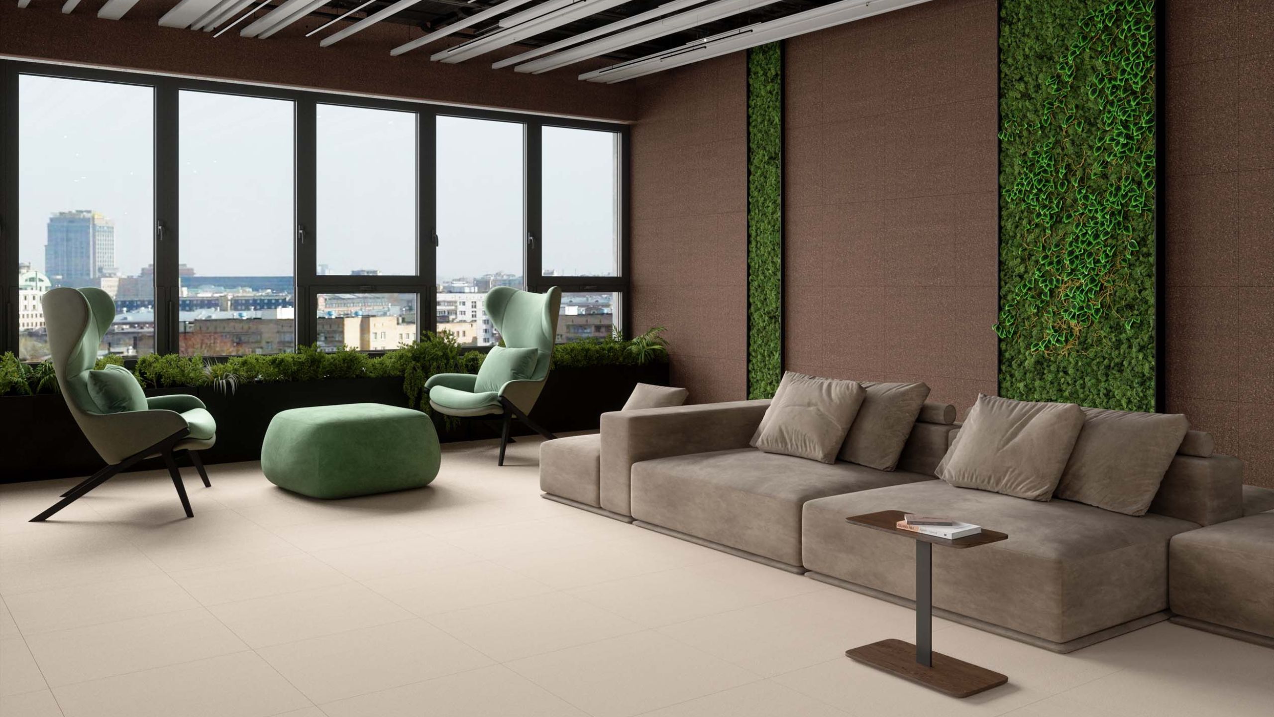 Если стиль офиса лофт, минимализм, можно присмотреться к керамограниту, который похож на бетон. Это могут быть коллекции Luna, Loft или оригинальный цветной керамогранит коллекции Spectrum линейки Ametis by Estima.