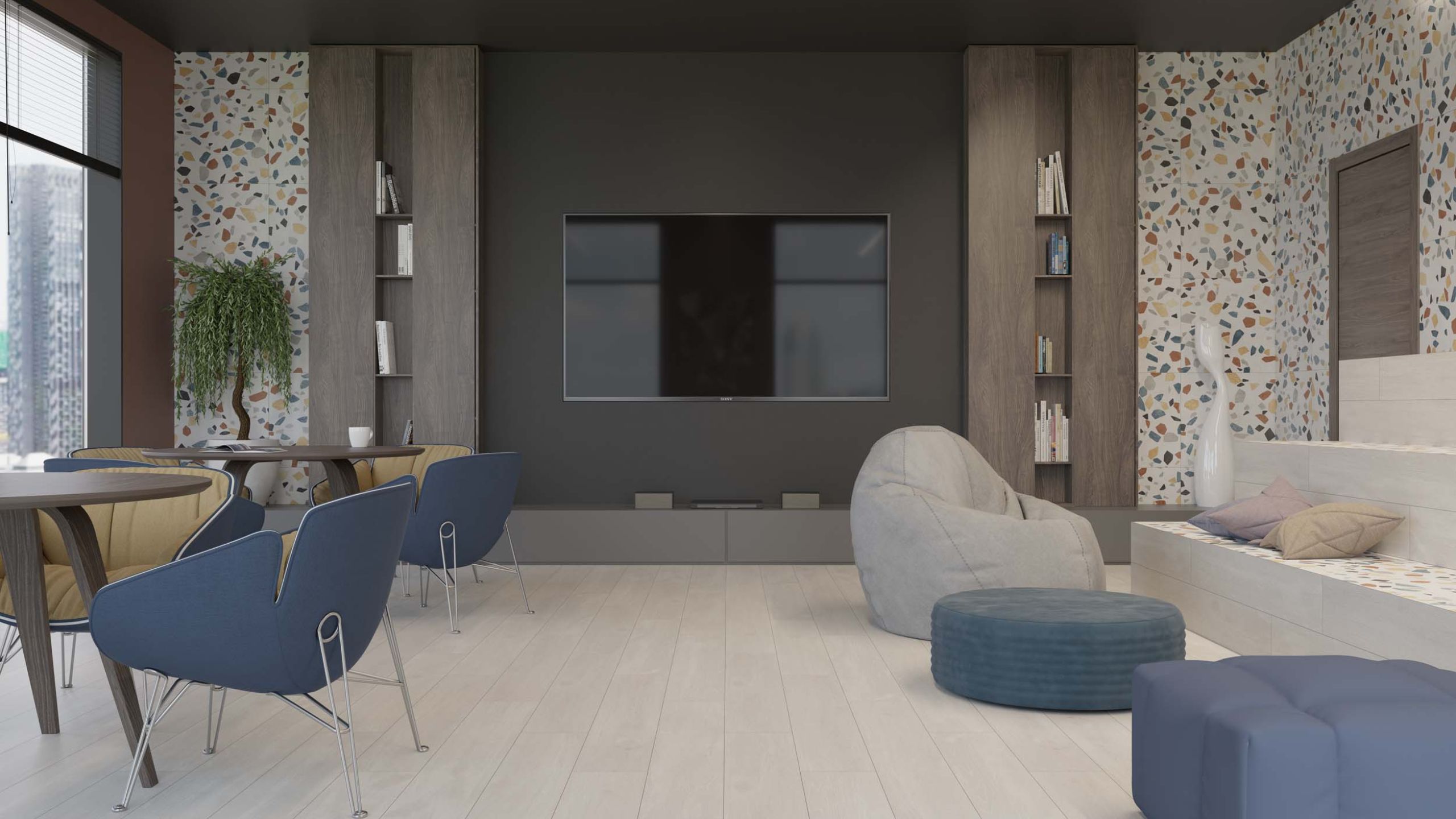 В зависимости от дизайна современного офиса можно подобрать керамогранит, который похож на натуральный камень, мрамор, дерево или бетон. Все зависит от выбранного стиля. Так, для классического интерьера офиса подойдут коллекции, которые по рисунку и текстуре напоминают натуральное дерево, например, коллекция Selection из линейки Ametis by Estima или Kraft Wood.