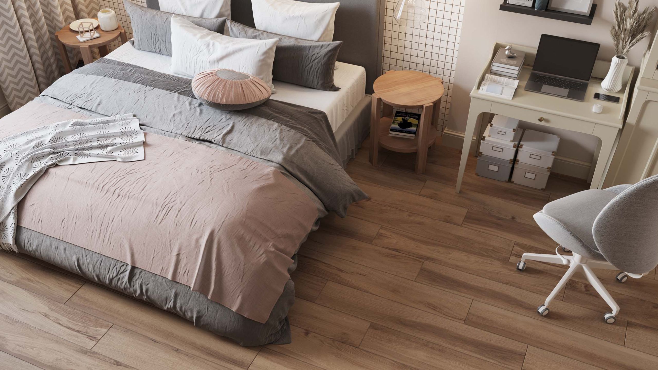 Пол может стать как ярким акцентом в комнате для подростка, так и обрамить интерьер. Все зависит от фантазии и дизайнерских предпочтений жильцов. Для тех, кто хочет подчеркнуть индивидуальность комнат активных подростков, отличным решением станет керамогранит. Он схож с различными материалами: