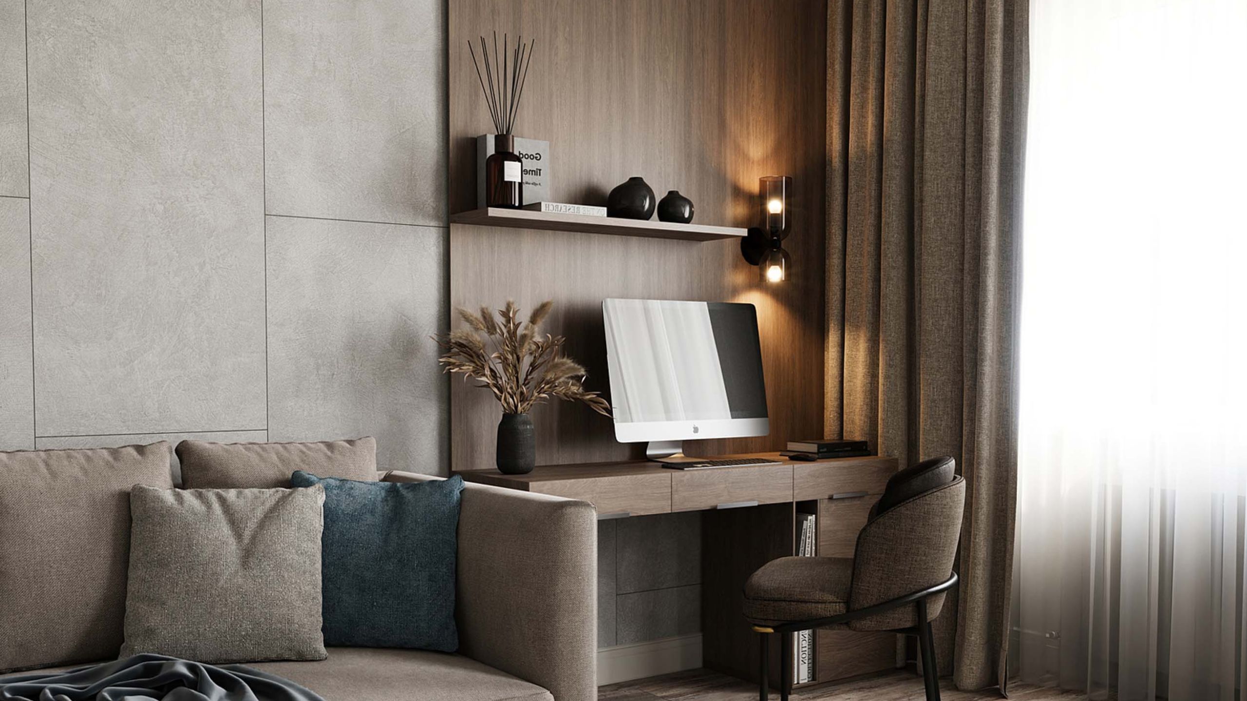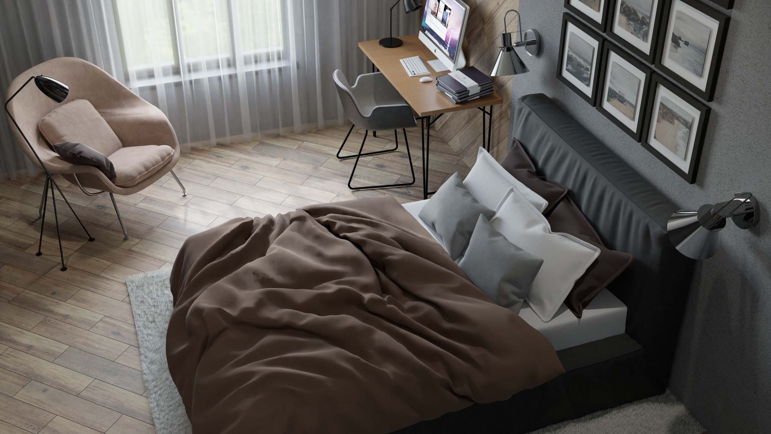 Сохранить полезную площадь можно, сделав скрытые стеллажи для хранения вещей. Например, их можно вмонтировать в основание кровати. Если в комнате высокие потолки, можно организовать двухуровневую зону. На первом этаже можно расположить рабочую зону: установить стол с компьютером, на верхнем — разместить спальное место.