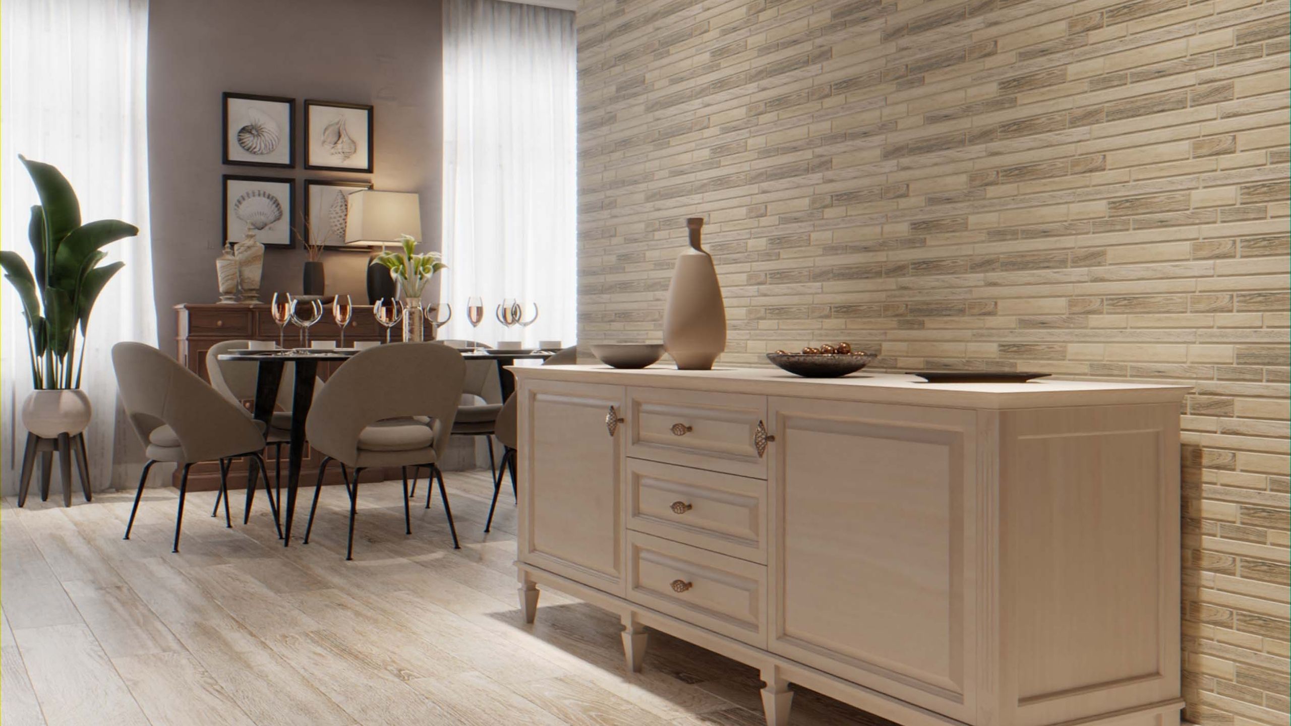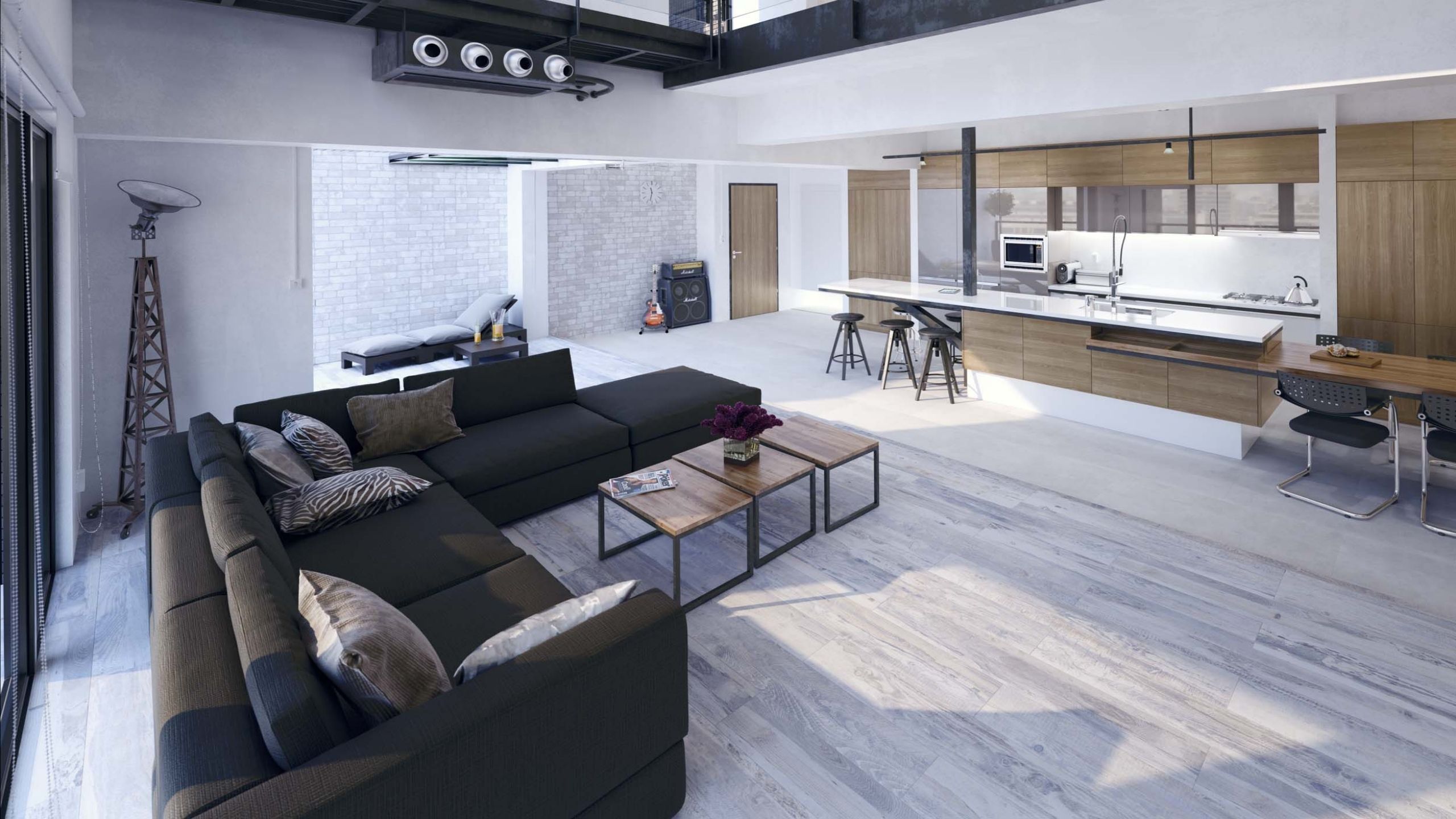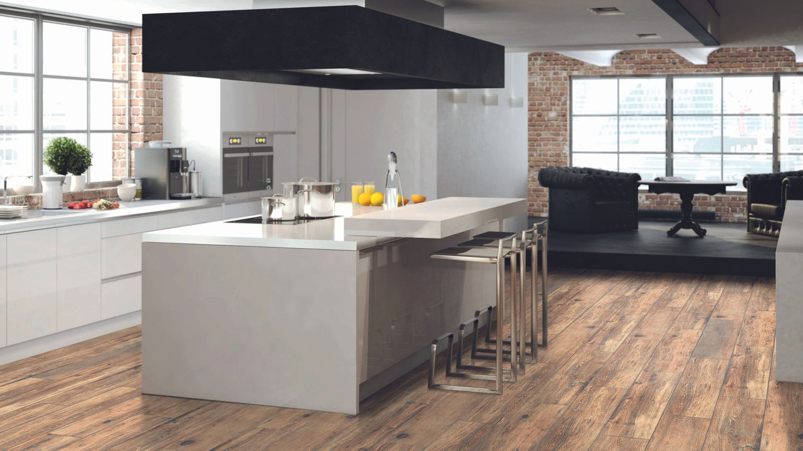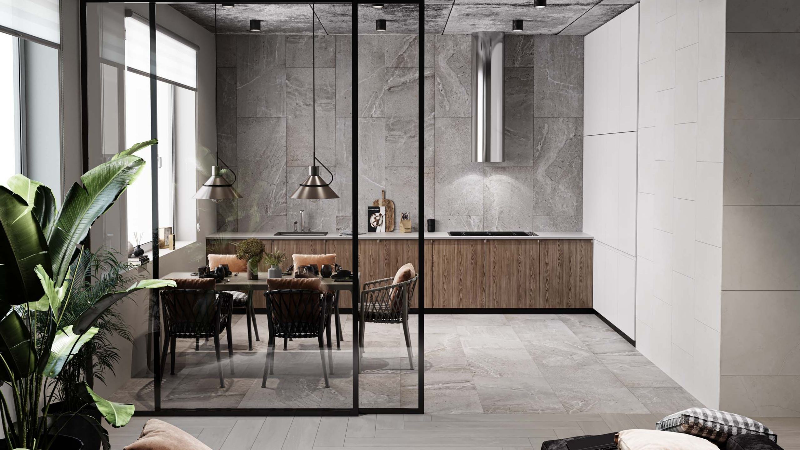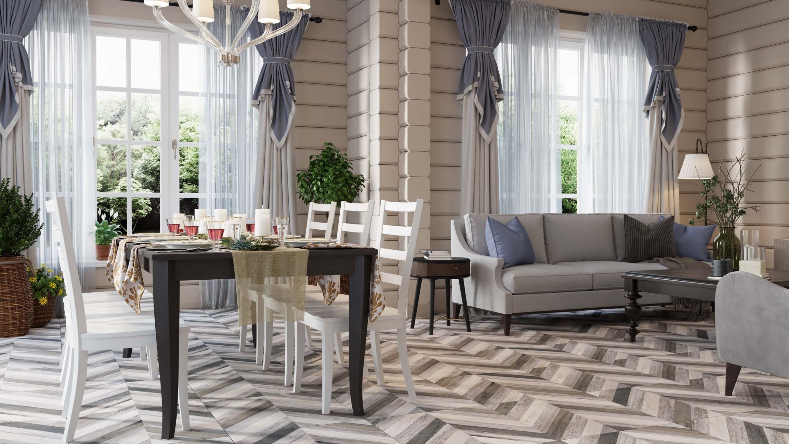 Кстати, пол не обязательно делать деревянным. Вместо него, можно использовать керамогранит с имитацией натурального дерева. Такой материал отлично подойдет для зоны кухни по своим эксплуатационным характеристикам, а дизайн будет уместно смотреться и в зоне гостиных. При этом в помещении будет единый пол — такая тенденция сейчас на пике популярности.