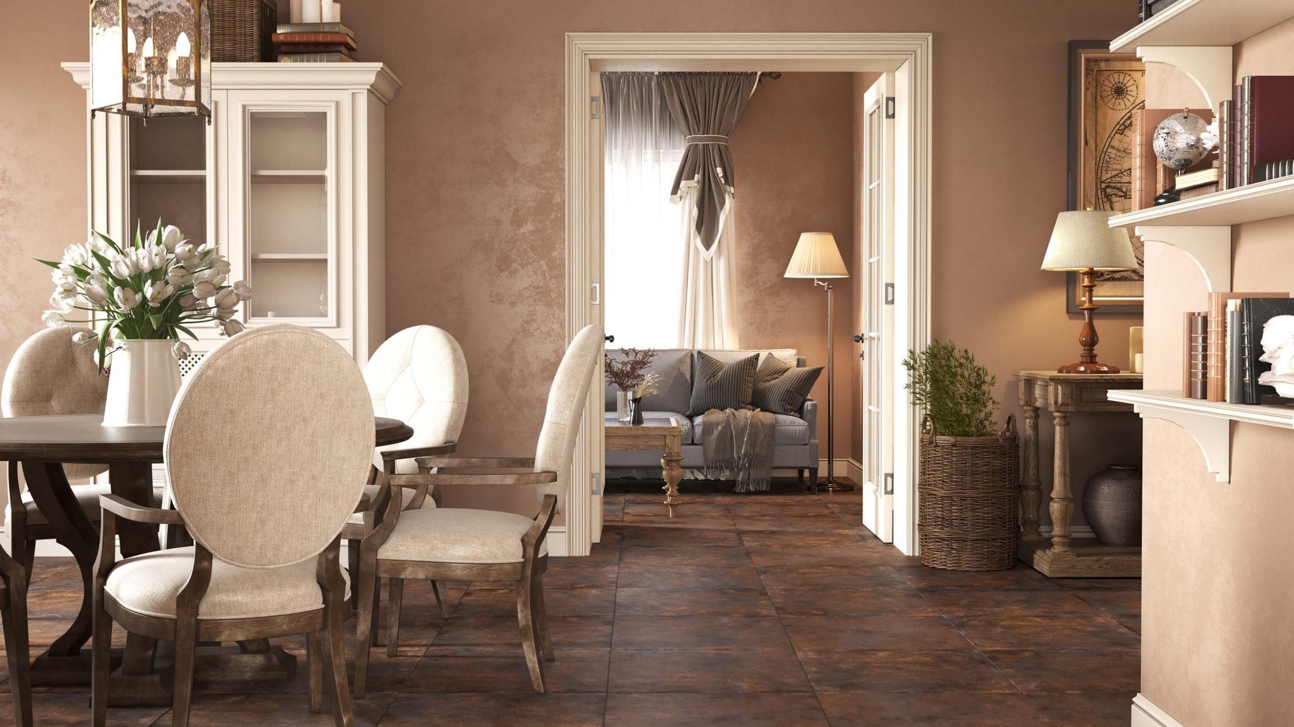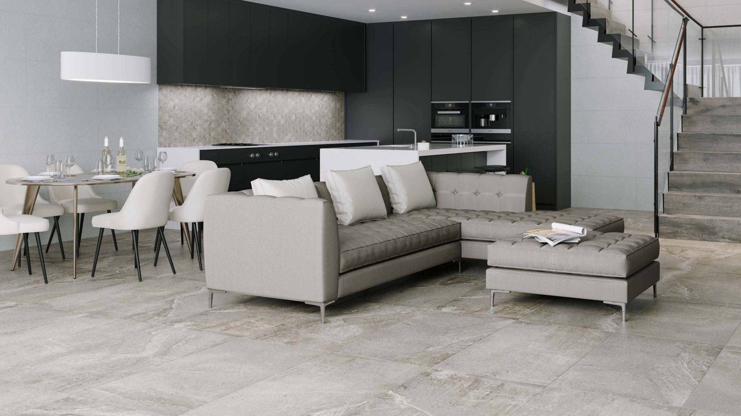 Ламинат нельзя рекомендовать для укладки на кухню, тогда как керамогранит для гостиных — вполне подходящее решение, если установить теплый пол. За счет все той же высокой теплопроводности керамогранит очень быстро нагревается и хорошо передает тепло.