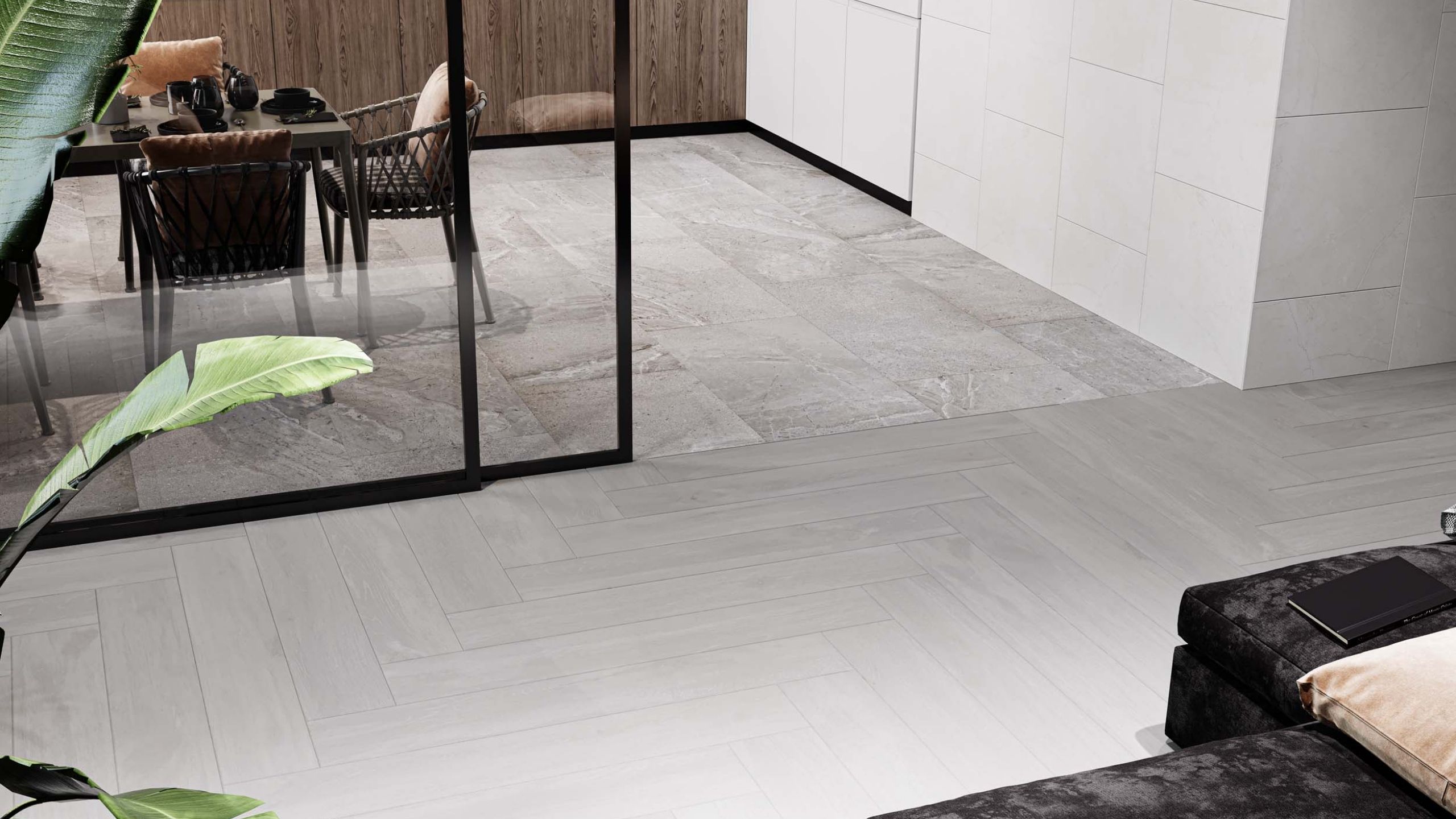 - Два вида напольного покрытия. Например, в гостиной можно уложить ламинат, а в зоне приготовления еды — керамогранит. Как вариант, можно даже выбрать керамогранит с имитацией рисунка и текстуры настоящего дерева. В этом случае удастся сохранить целостность восприятия общего пространства, а каждая функциональная зона получит наиболее подходящую отделку.
