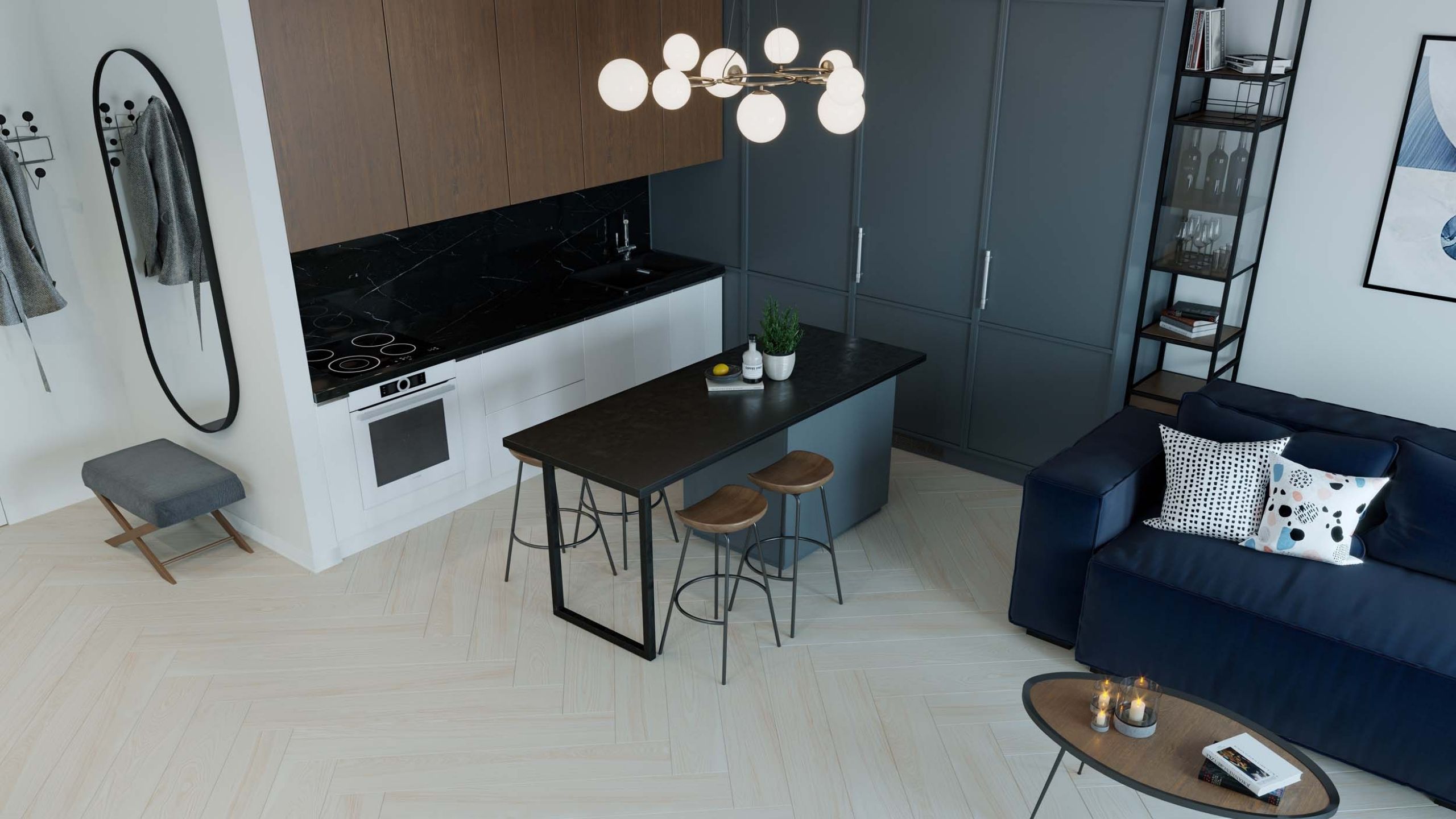 - Кухня с островом — оптимальное решение для помещений площадью от 20 м². Так вы получаете много места для хранения и дополнительную столешницу, а также визуальное зонирование пространства. Для квартир-студий меньшего размера рекомендуем сделать кухонный полуостров.