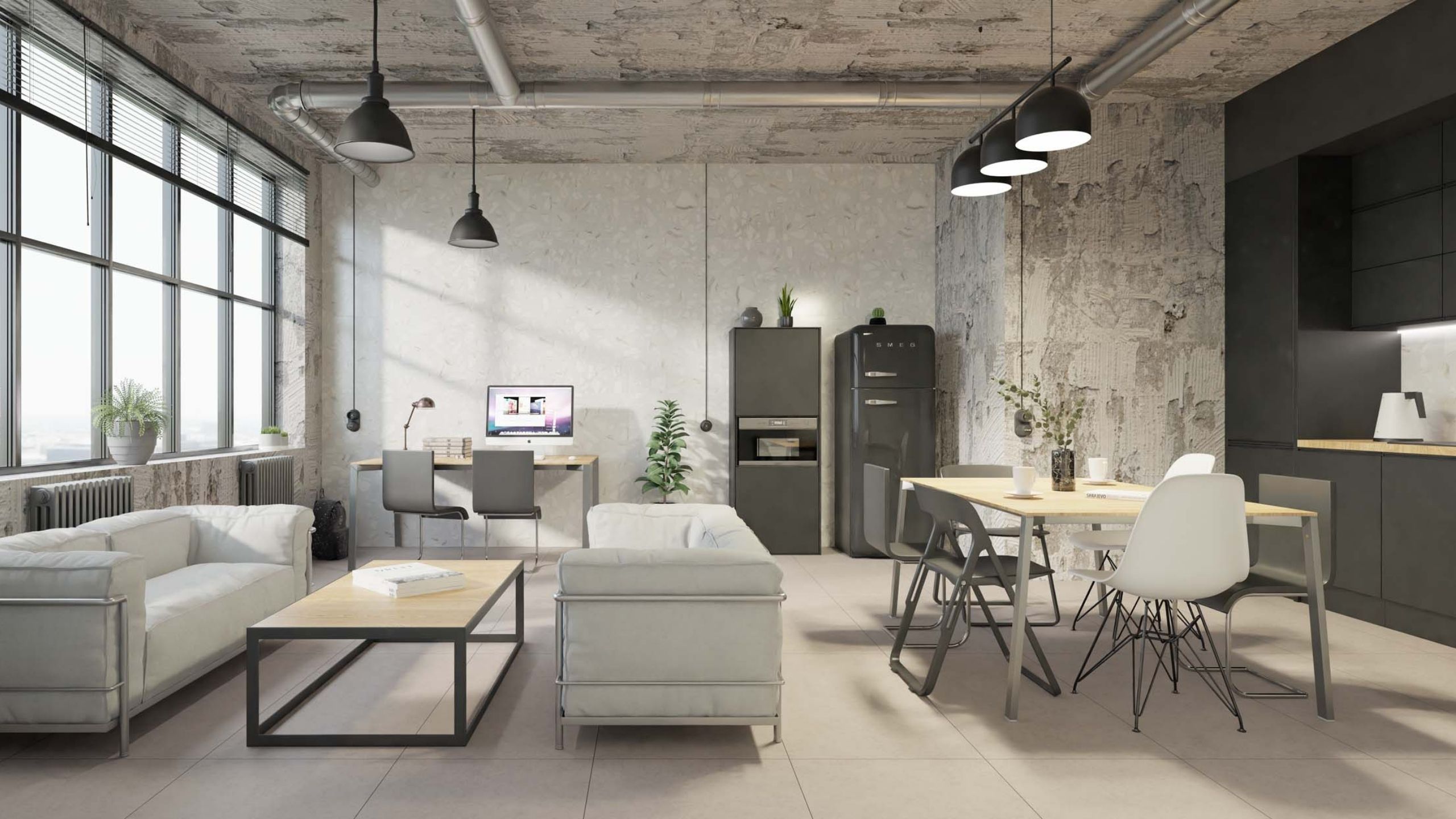 При первом варианте объединения пространства важно создать некоторое зонирование — отделить рабочую зону от зоны отдыха.