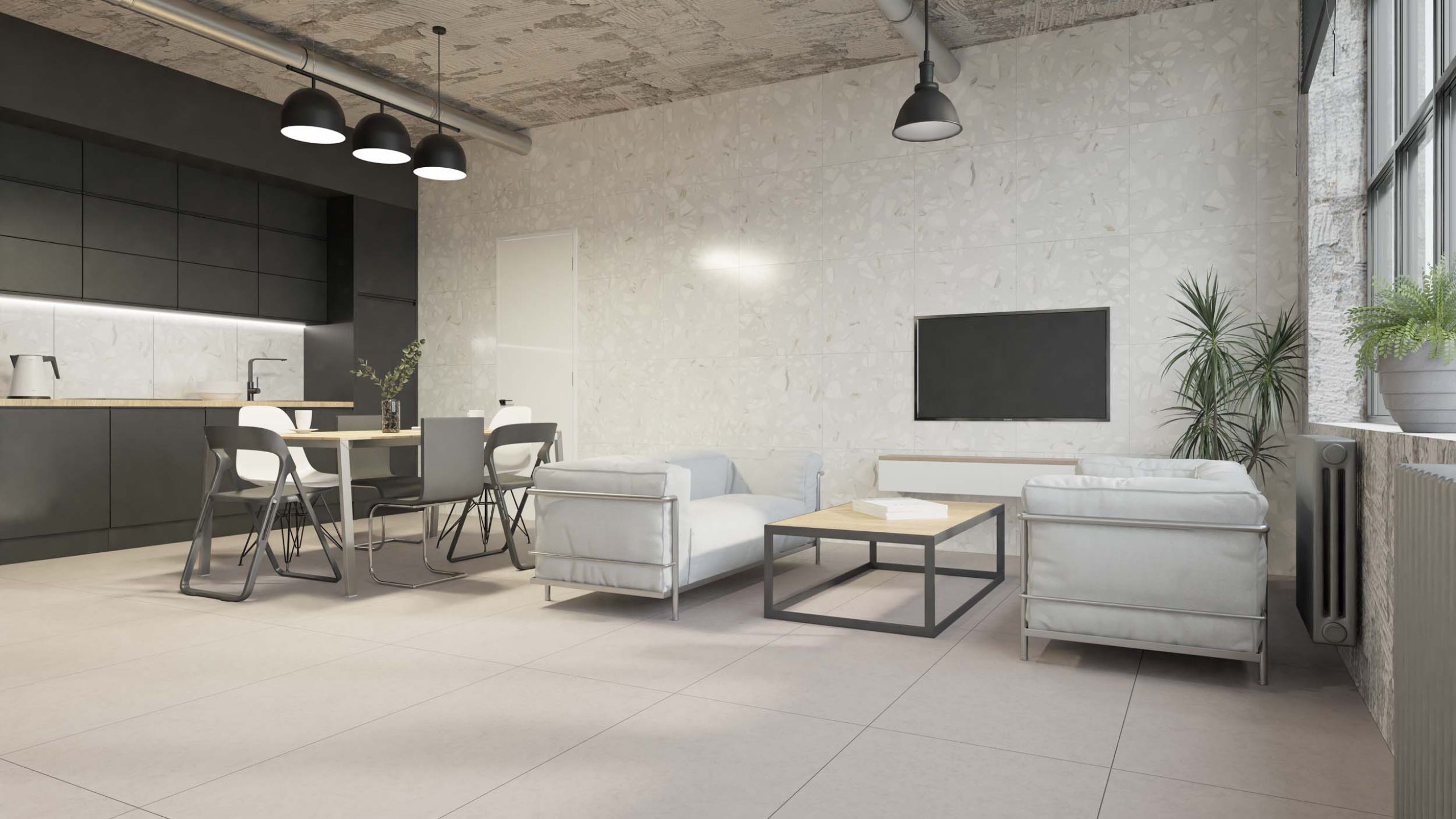 Для кухни-столовой подбирают отделку, которая выдерживает сложные условия эксплуатации. Например, плитку, стекло, металл и даже кирпич. Но интересно смотрится кухня со столовой в облицовке керамогранитом. Он не впитывает влагу и грязь, легок в уходе и долго служит. Например, в салоне «Студия керамики Estima» представлены коллекции, которые подойдут для кухонь-столовых при оформлении под дерево — Brigantina, Artwood, мрамор — Marmulla, Supreme или камень — Rock, Gabbro. В стиль лофт впишутся коллекции, которые схожи с металлом: Patina или бетоном: Traffic, Loft.
