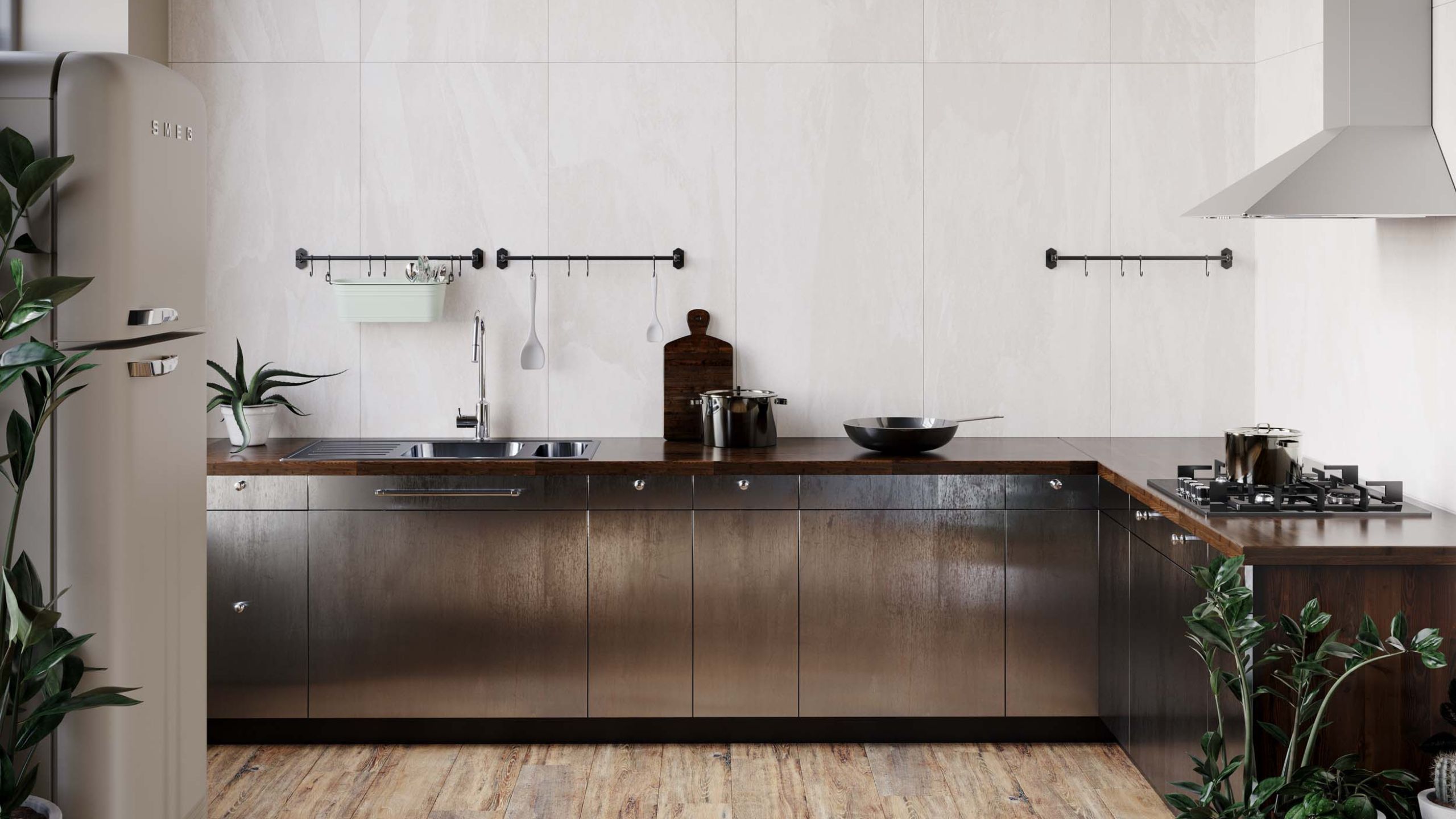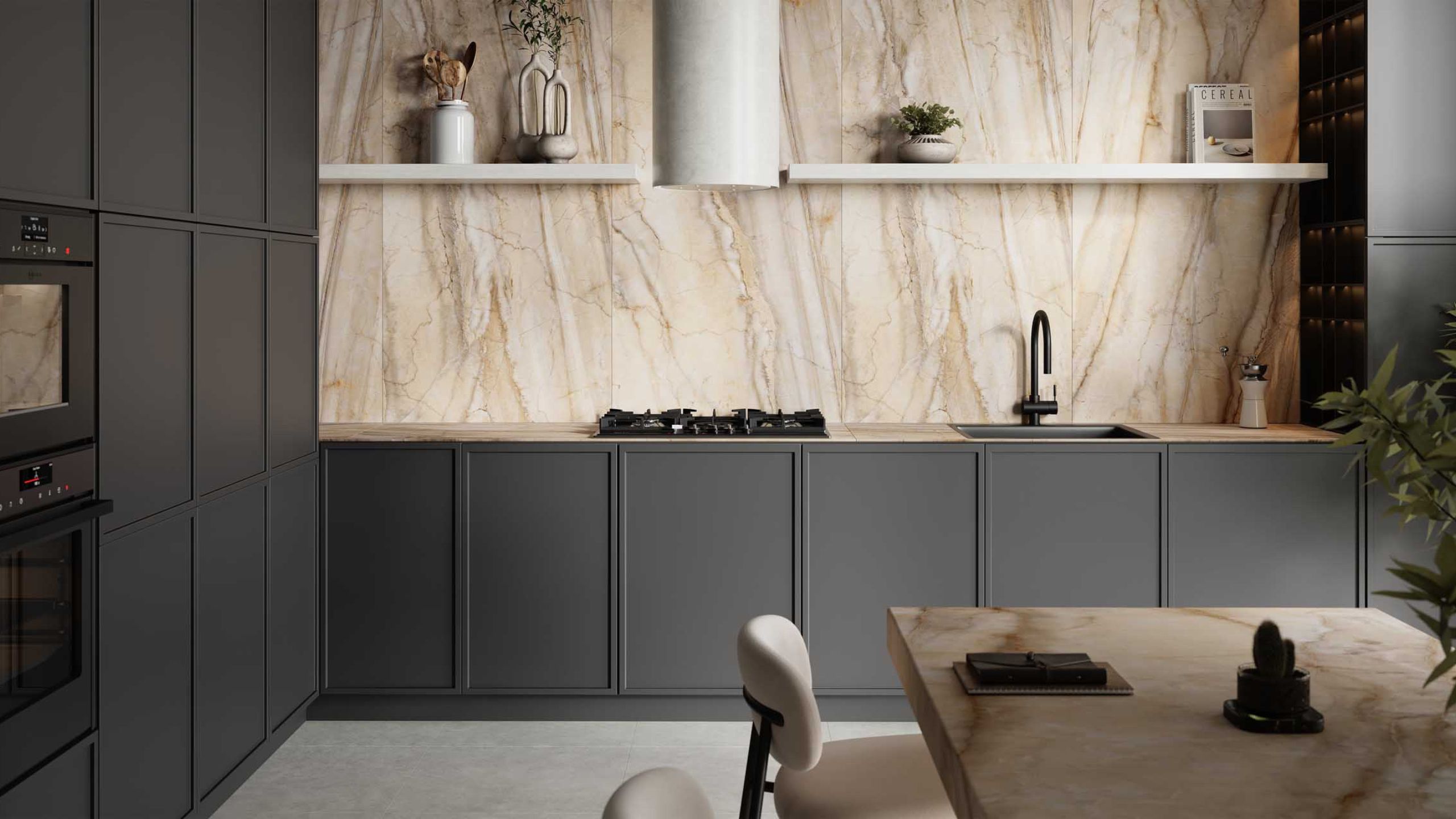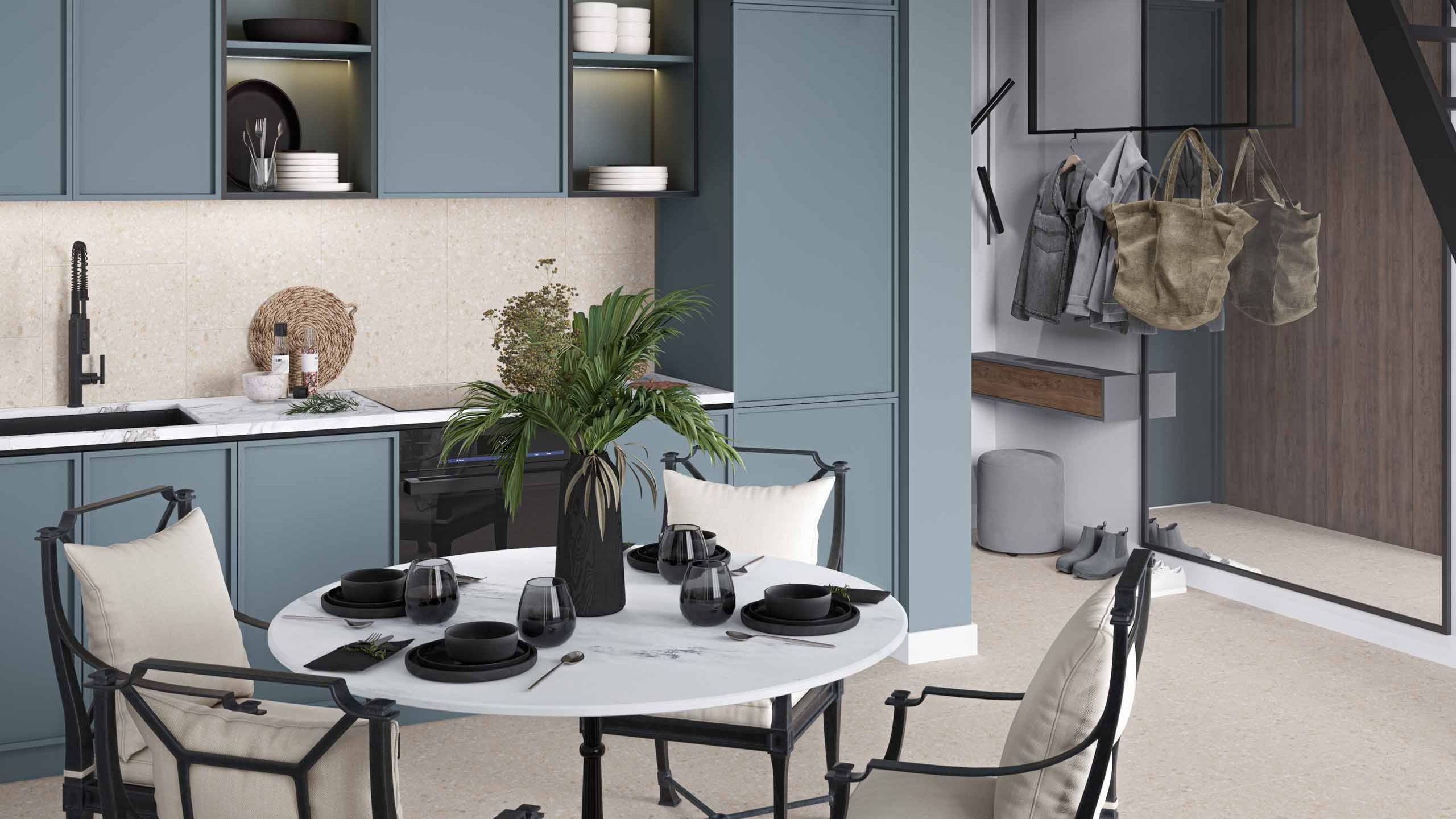 Если хотите сделать пол единым полотном для кухонь-столовых, то обратите внимание на керамогранит. В салоне «Студия керамики Estima» представлена премиальная линейка Ametis by Estima, которая воссоздает текстуру природных материалов. Или широкоформатная линейка XXL, чтобы было проще создать единое пространство на полу.