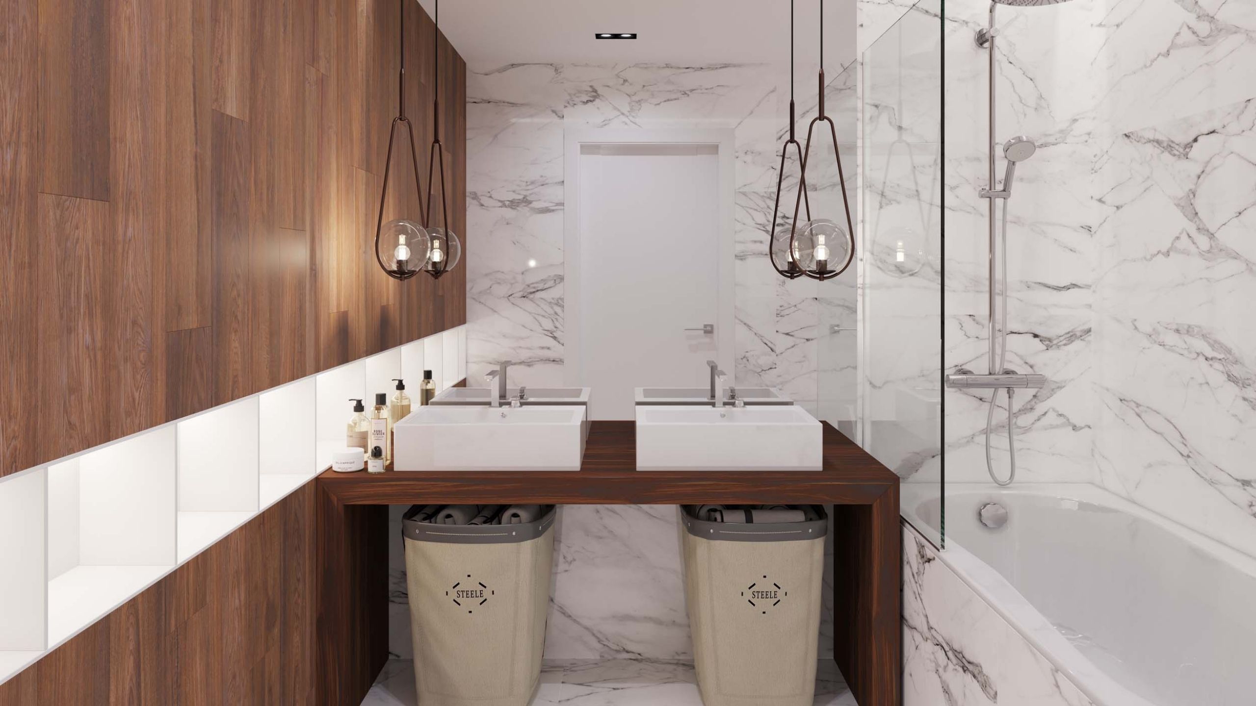 установите встроенную мебель и подвесную сантехнику;