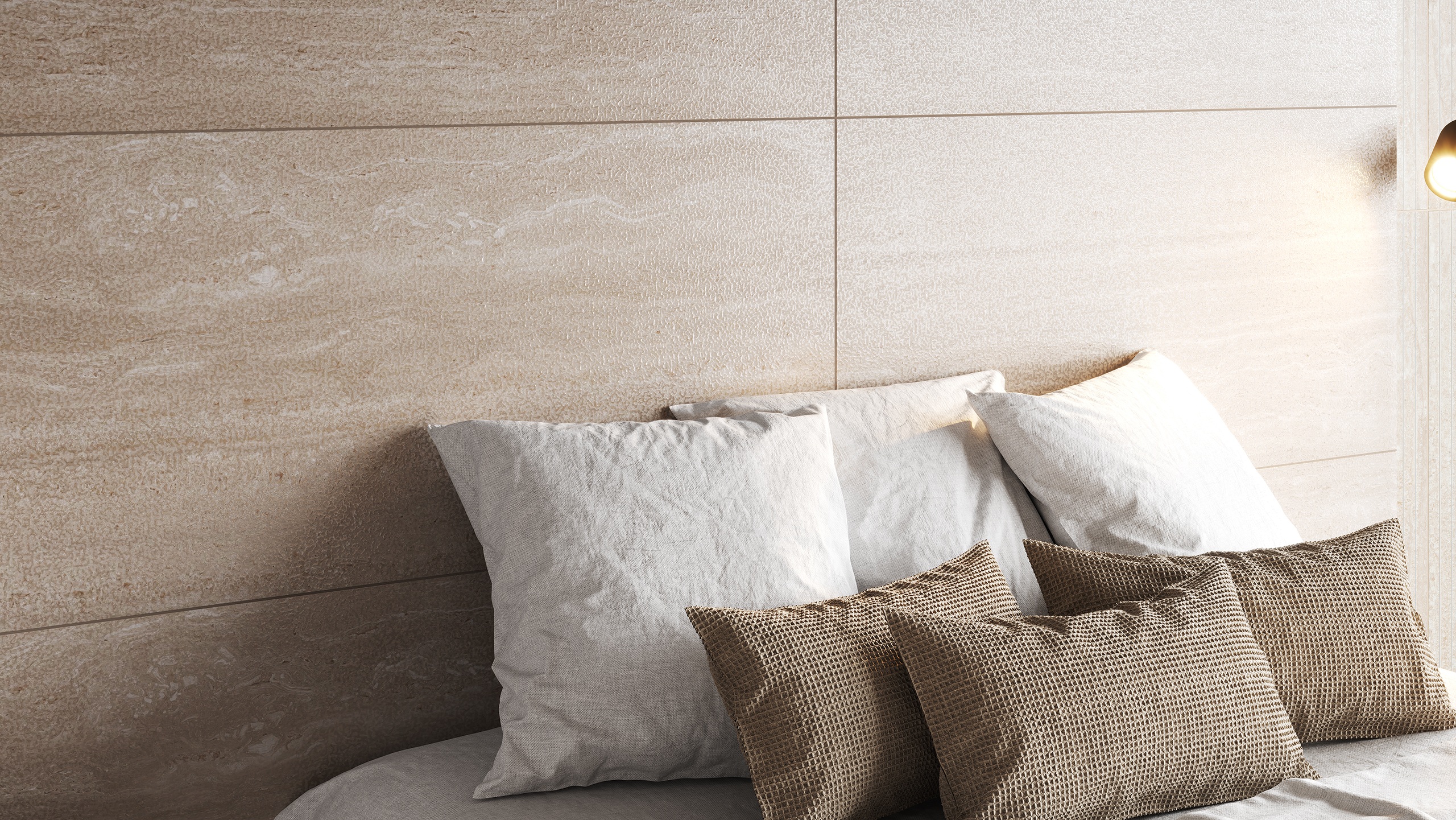 Чтобы зритель расширить, увеличить такую спальню, стоит выбирать светлое, но фактурное покрытие для облицовки. На фото ниже можно увидеть интерьер с керамогранитом Tolanto, который как раз украшает стены и подиум для кровати.