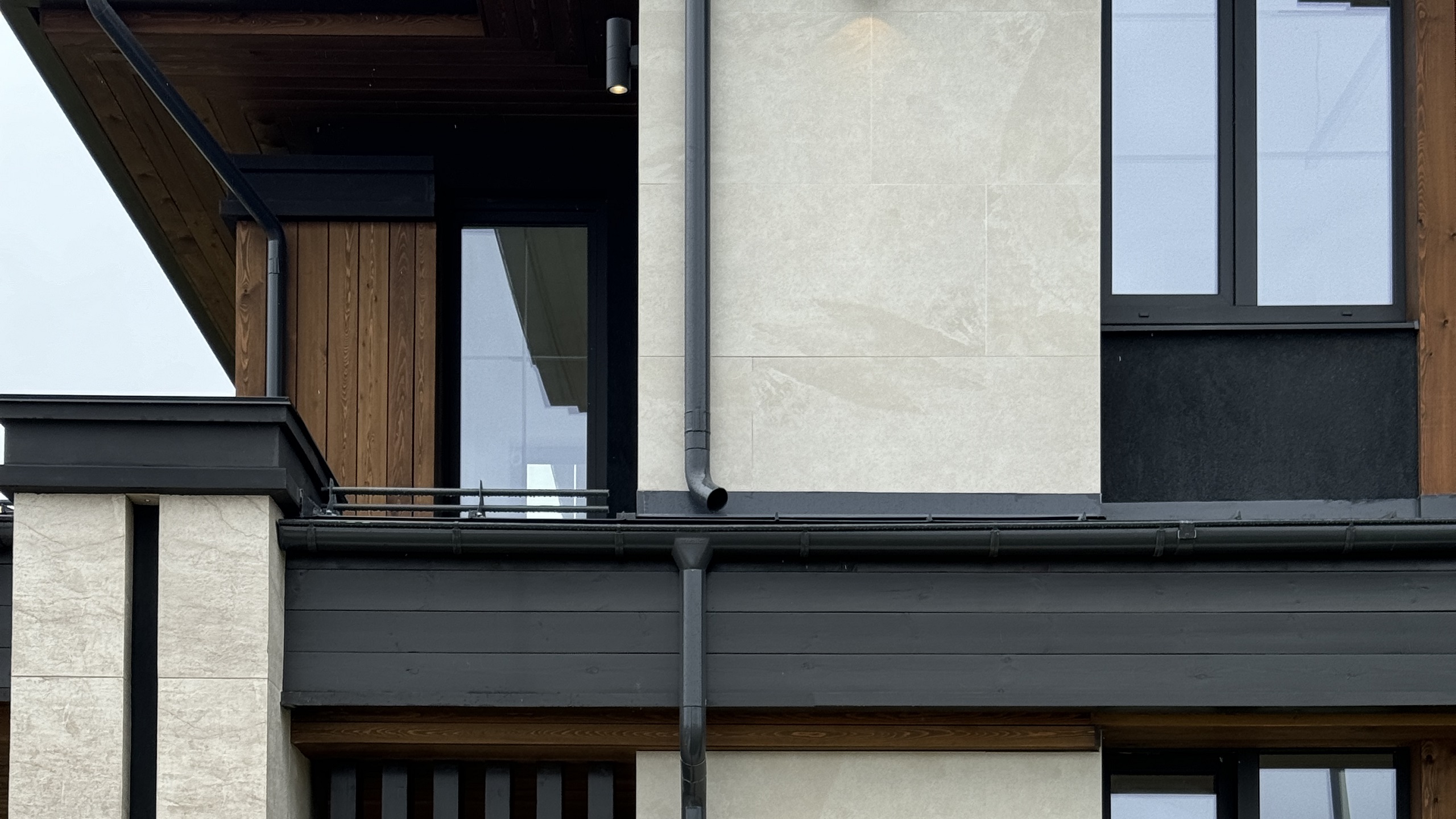 Одним из ярких примеров применения керамогранита стал дом от строительной компании «АПС ДСК», где для отделки фасада использовалась коллекция Terra формата 60×120 см. Этот керамогранит идеально имитирует текстуру натурального камня, придавая фасаду элегантный и солидный вид, что делает его отличным выбором для загородного дома в любом современном стиле.