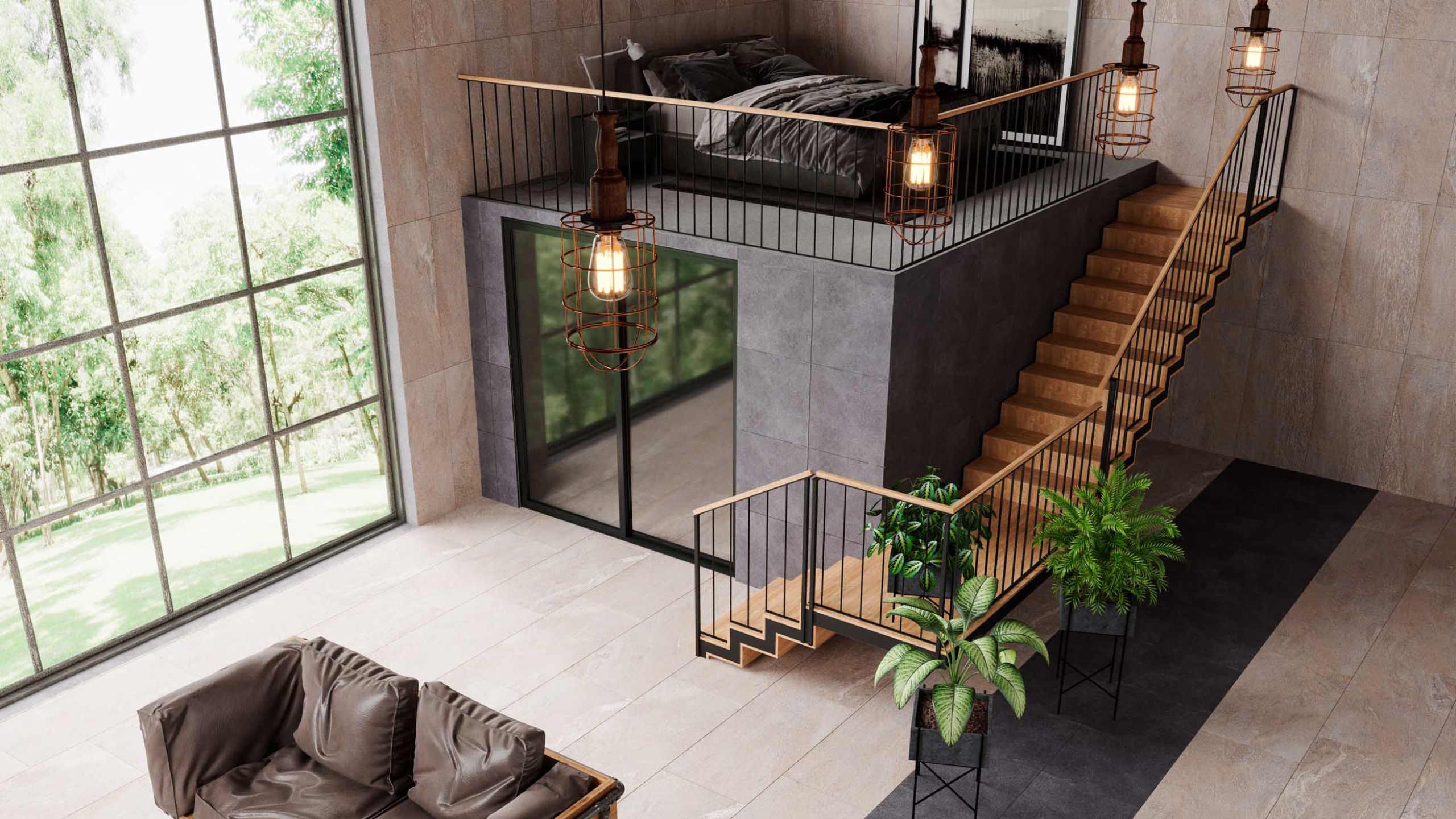 - Зонирование по вертикали. Если дом строится с нуля и в задумке воплотить конкретно индустриальную стилистику, то важно обыграть перекрытия и вход на второй этаж. На втором этаже (антресоли) можно сделать уютную спальню, библиотеку или место для отдыха.