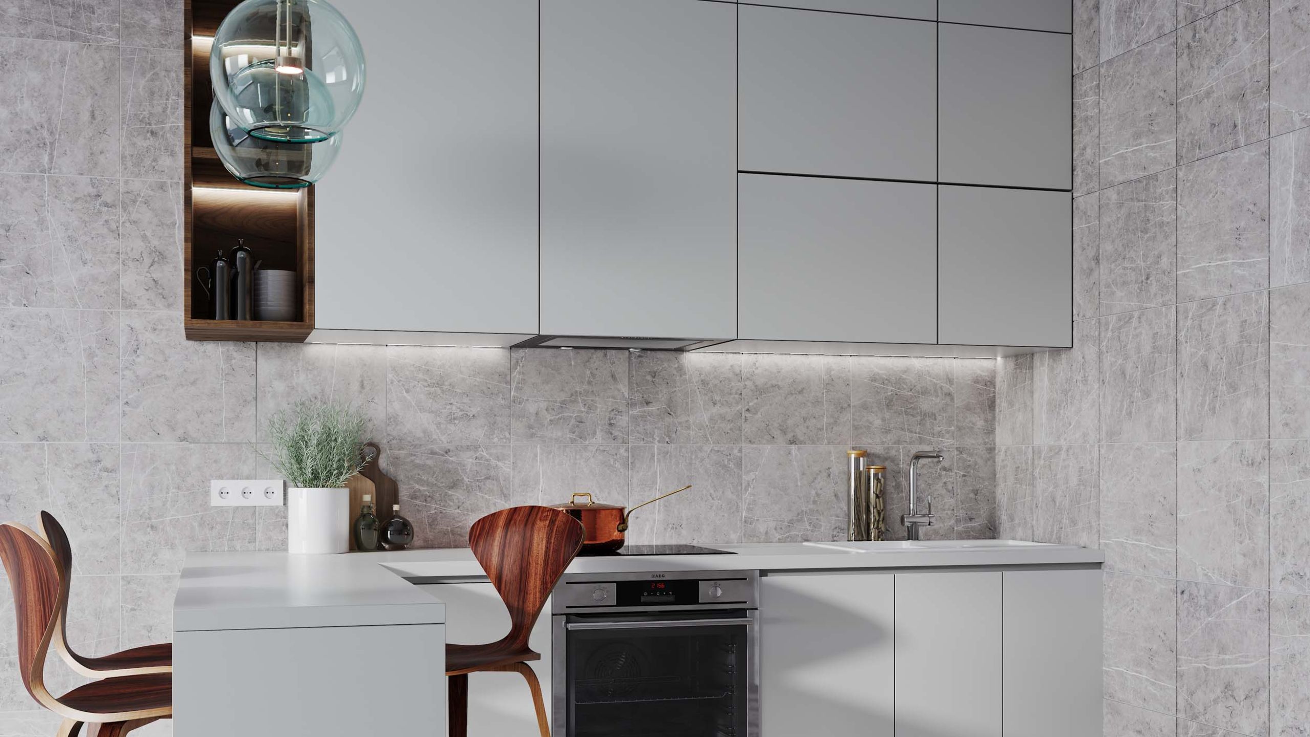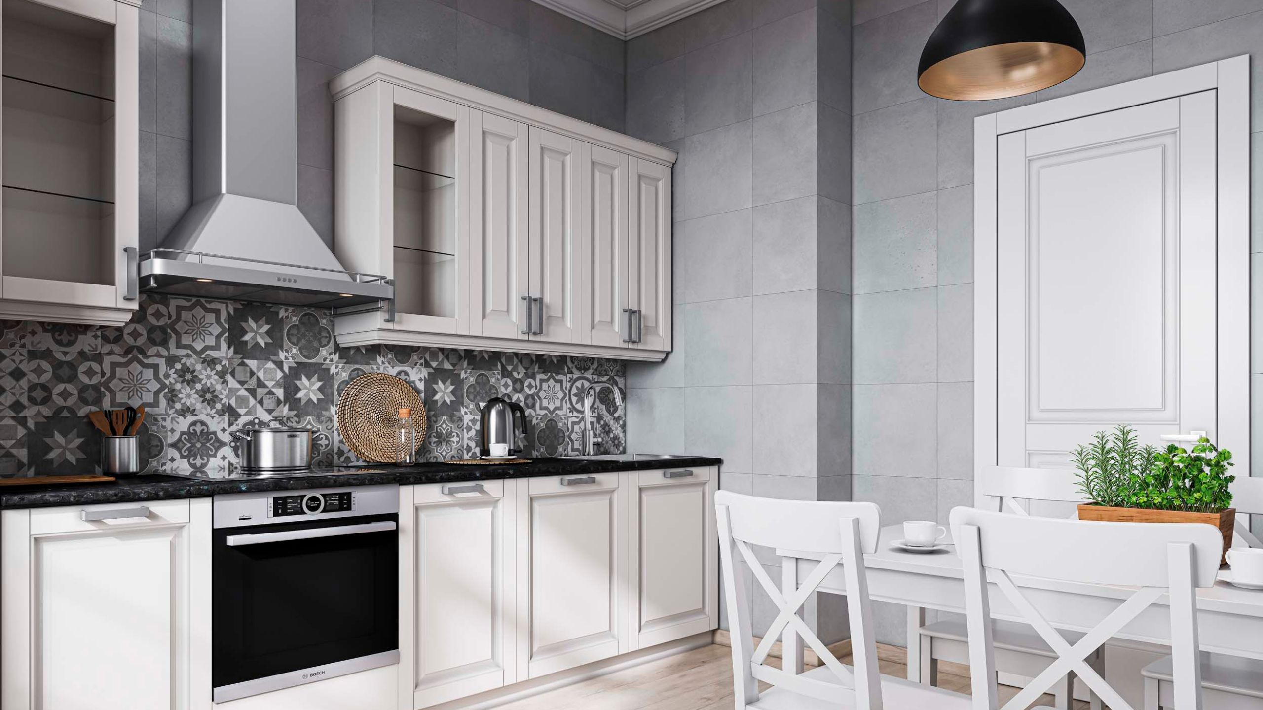 Универсальными считаются сочетания серо-белой цветовой гаммы, белого цвета и дерева, белоснежные варианты с серыми акцентами. В них добавляют яркие декоры, которые смягчают строгий внешний вид, и кухня выглядит легкой и уютной.