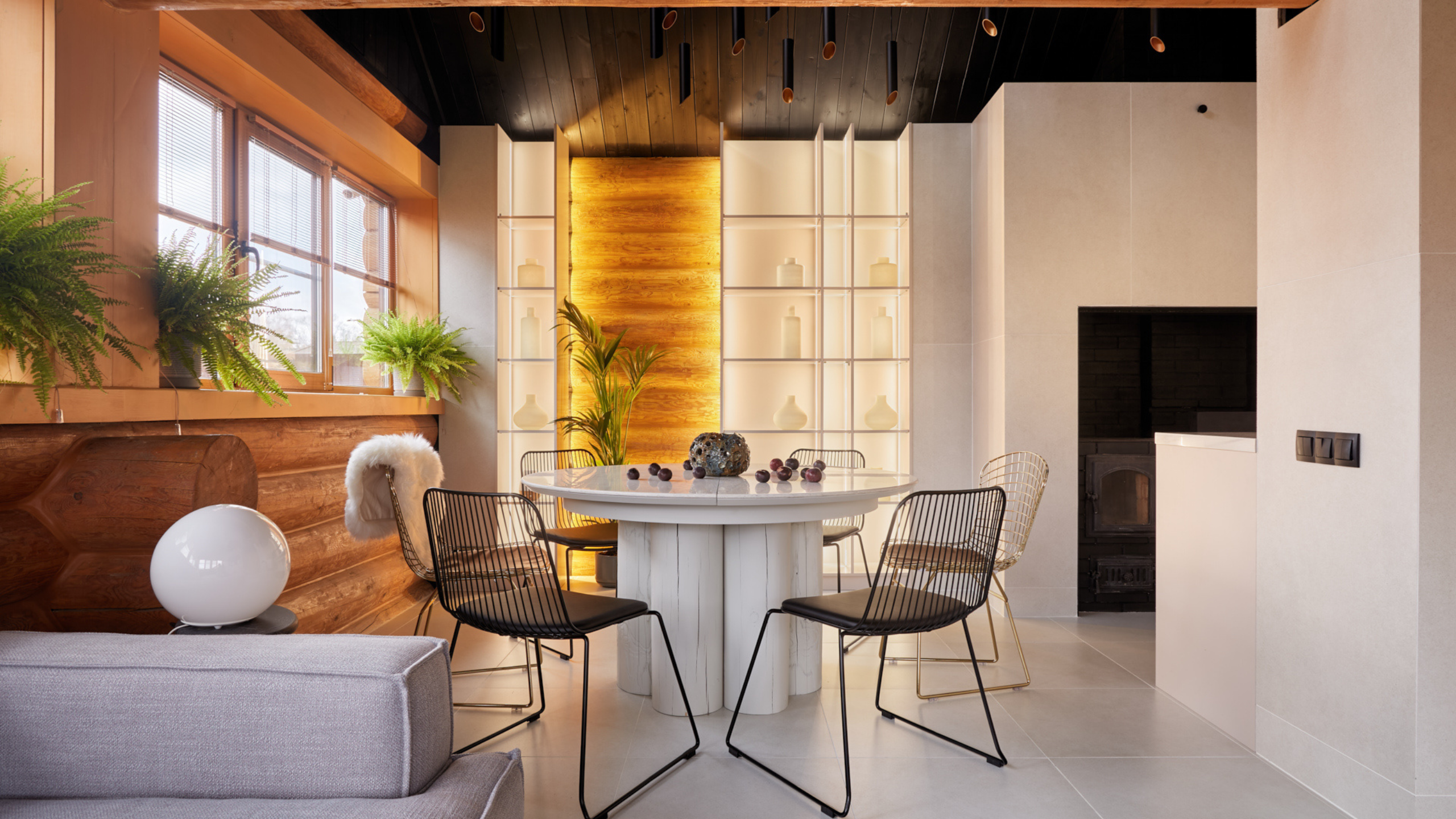 Материалы — темно-светлое дерево, камень, кирпич, бетон.