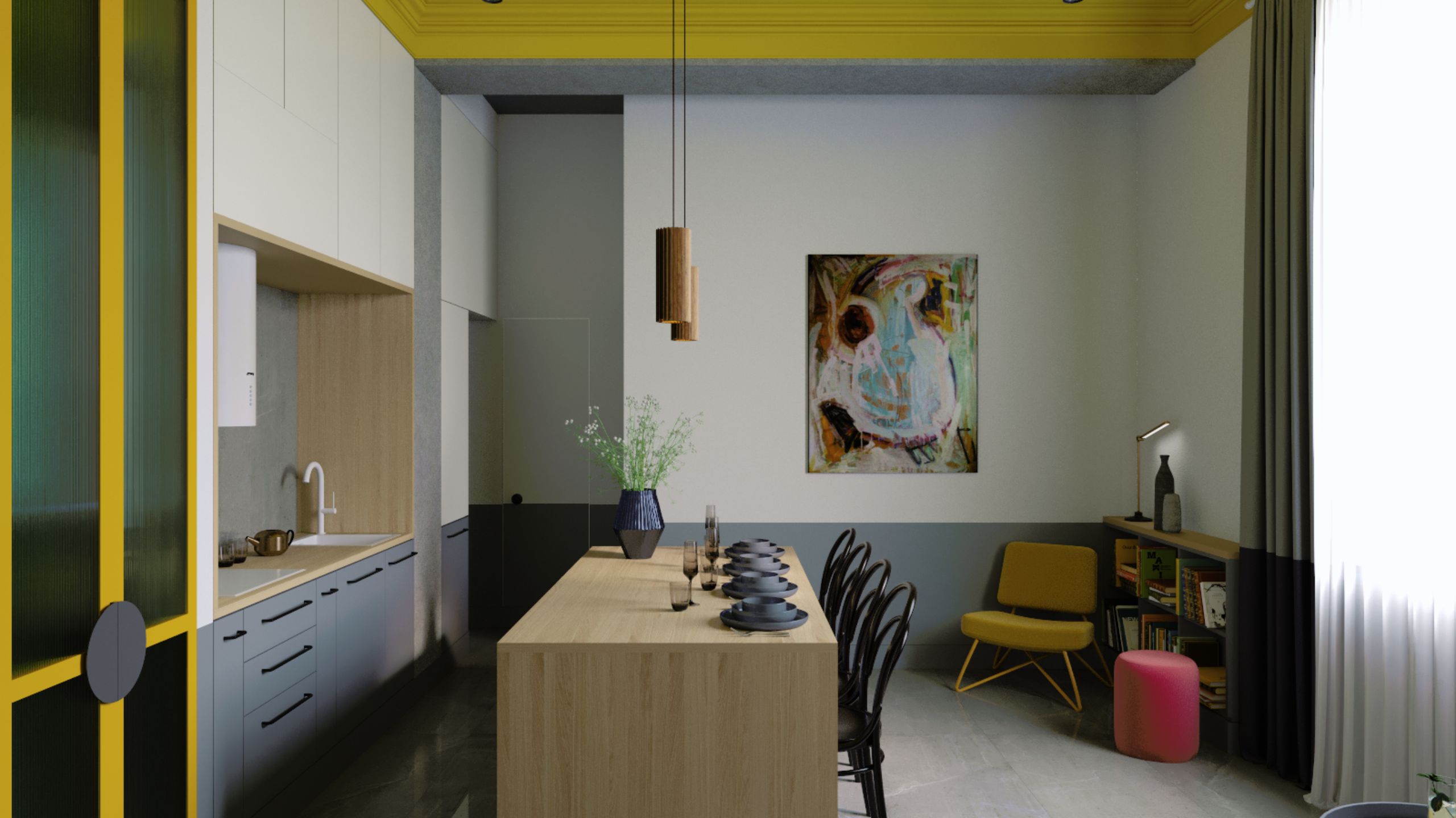 Интерьер для творческих людей. Отделка из грубых материалов или их имитации — кирпич, бетон, камень, необработанное дерево. Базовые цвета — черный, белый, серый, коричневый. В гарнитуре можно использовать фасады ярких цветов, матовых оттенков: желтые, зеленые, красные. Стены и потолок либо окрашены, либо имитированы под кирпич, бетон и т. д.