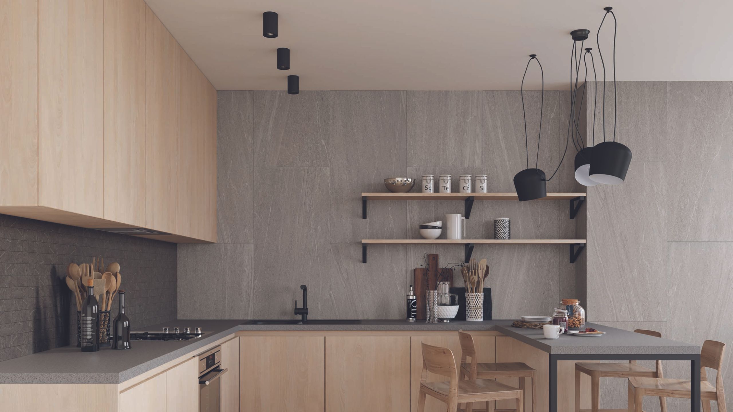 Острова из полированного керамогранита или натурального камня в тех же расцветках, что и столешница рабочей зоны, — продолжение общего дизайна на кухнях, они создают единство образа.