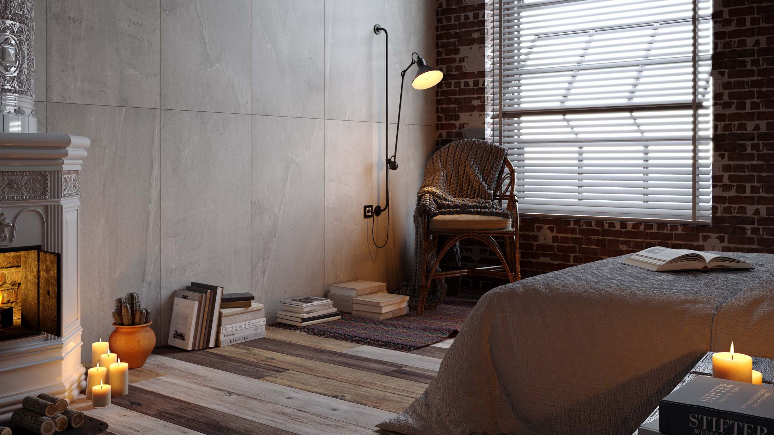Для напольного покрытия используют паркетную доску или керамогранит торговой марки Estima, а именно коллекцию Classic Wood. Благодаря высокой степени детализации, рисунок очень похож на натуральное дерево. Для удобства и уюта на пол стелят ковры из джута и даже шкуры животных. Или заменяют шкуры магазинными аналогами.