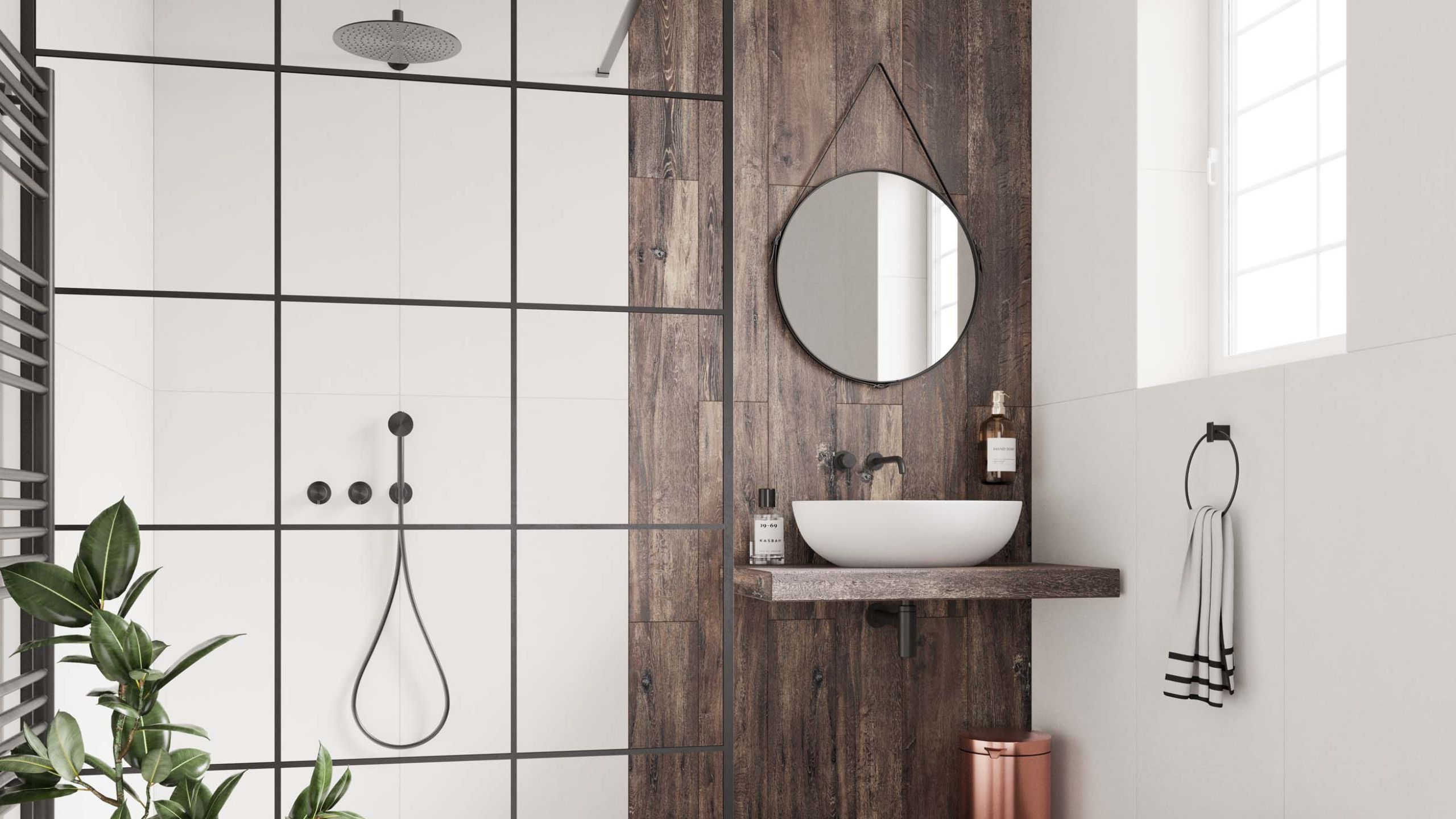 Главная загвоздка ванной — повышенная влажность. Поэтому дерево — бук, ясень, дуб — обязательно надо обрабатывать пропиткой или сразу искать качественные аналоги, которые не боятся влаги. Для таких целей оптимальнее всего подойдет однотонная керамическая плитка или керамогранит.