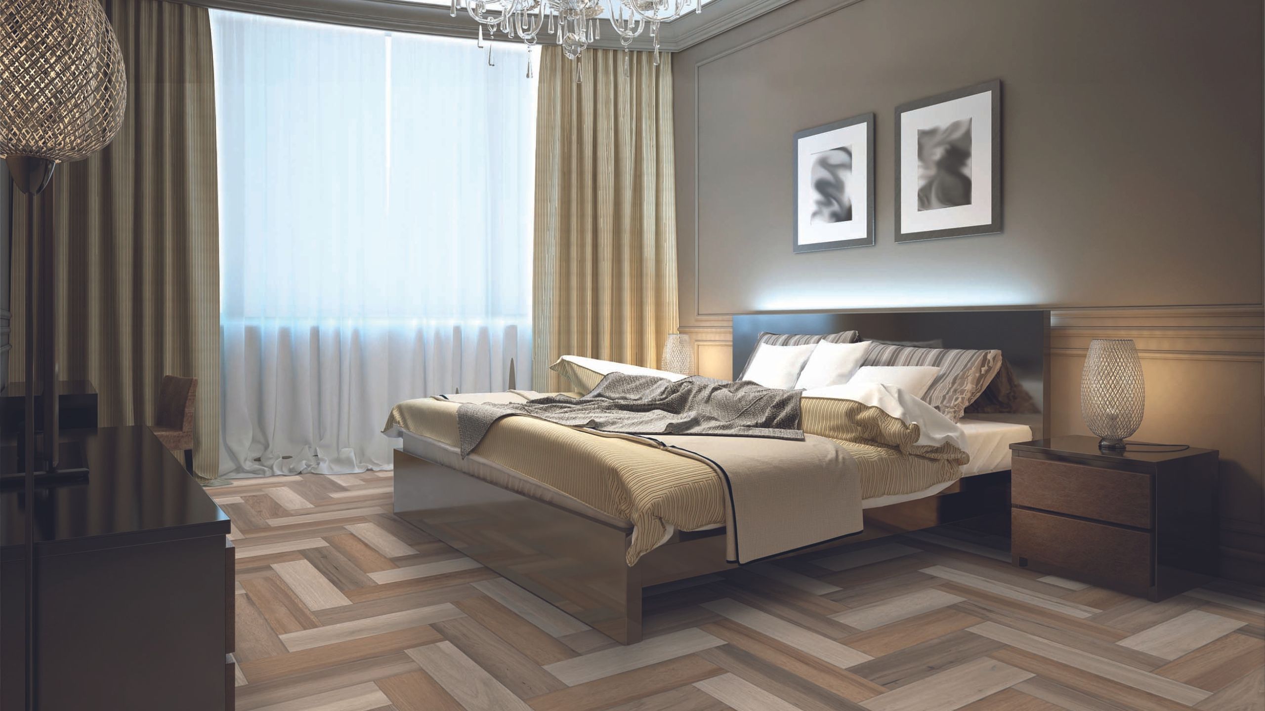 Удачное сочетание близких между собой цветов, поэтому и комбинировать их проще. Хорошо выглядит помещение, стены которого в бежевом оттенке, а пол — коричневый. Привлекательно выглядит напольная поверхность из керамогранита под дерево, как в коллекции Brigantina. Это идеальный вариант для стиля рустик. Потолок в таком случае может быть белым.