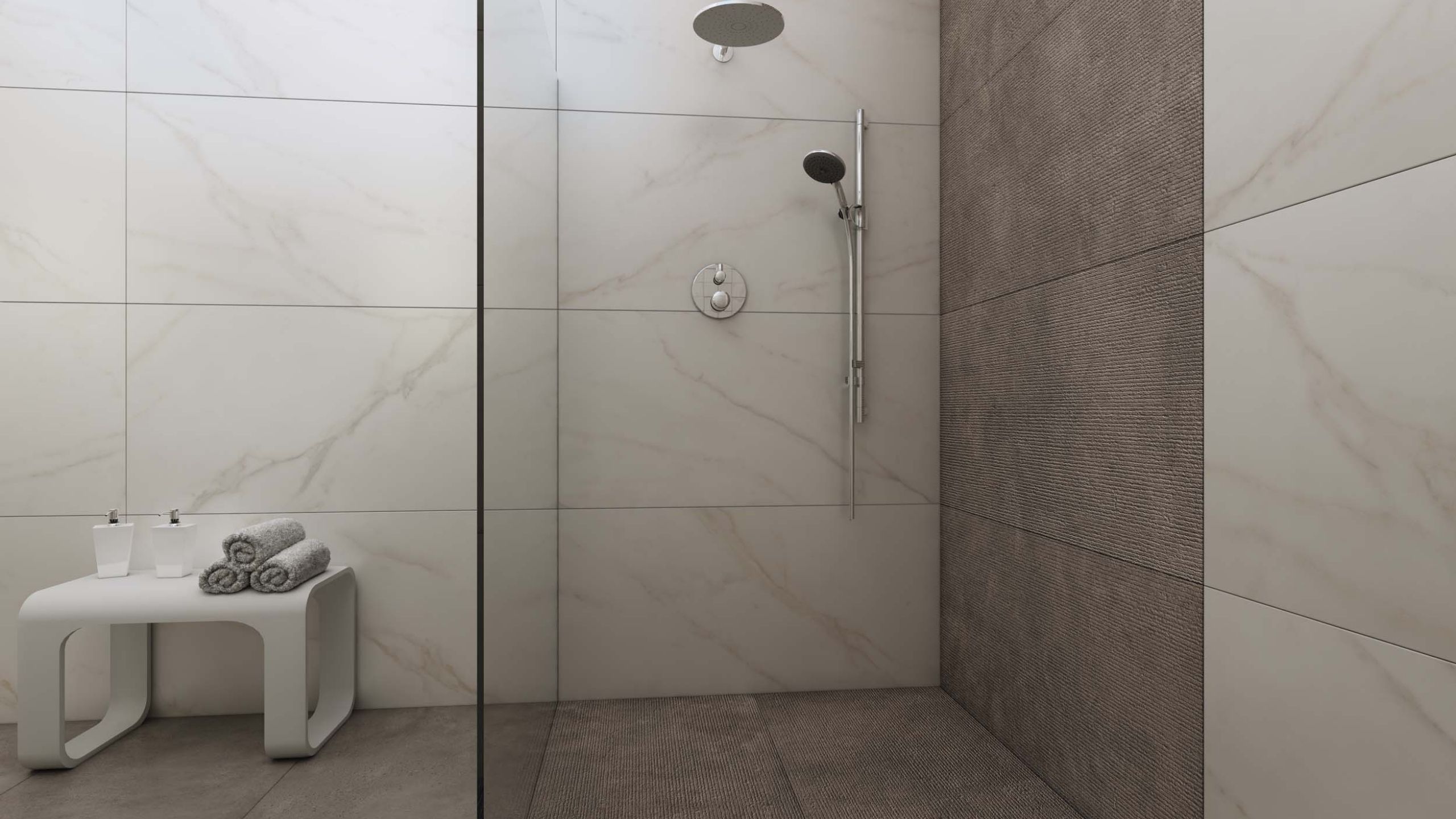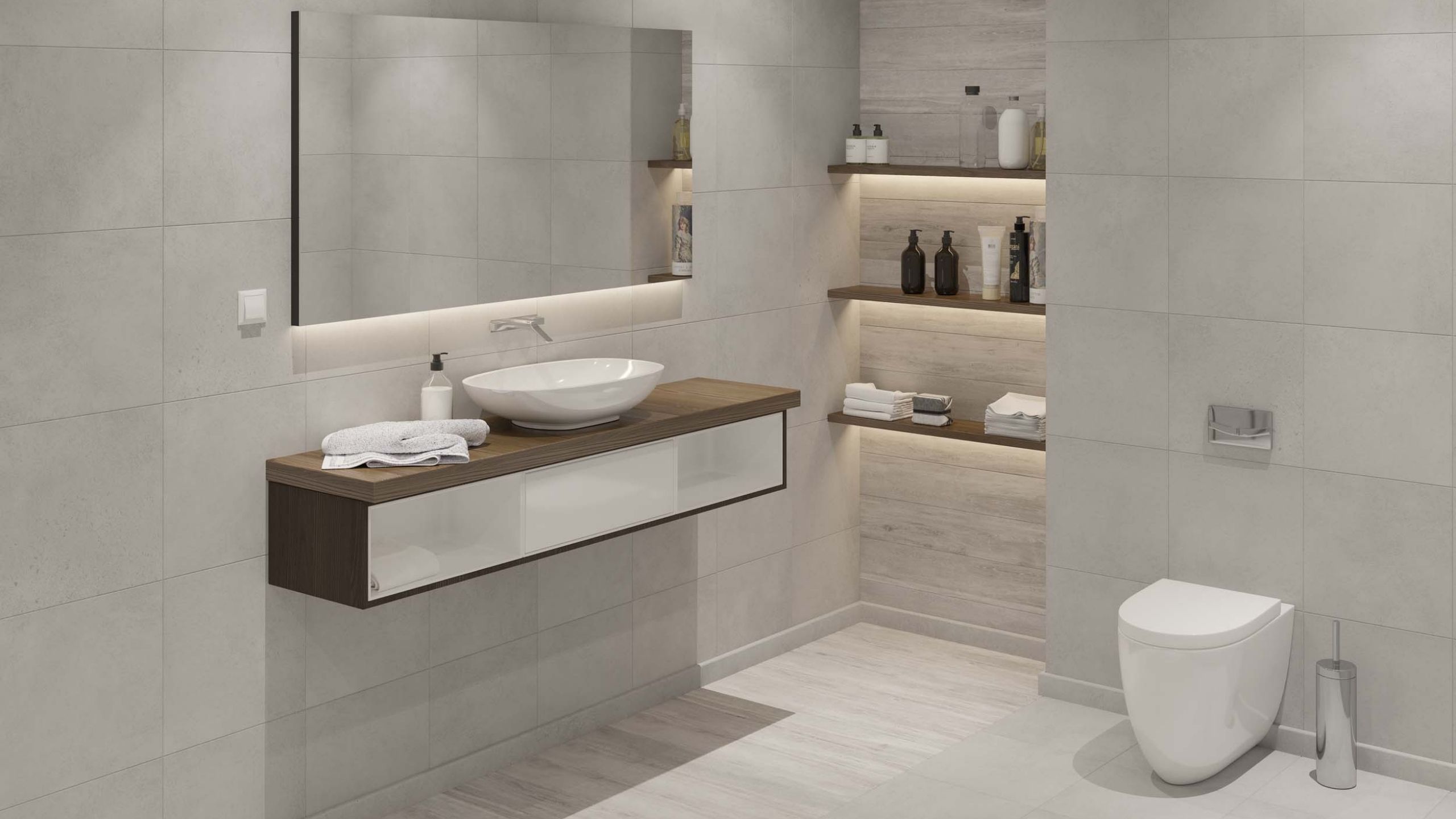 Размер плитки влияет не только на стоимость и концепцию дизайна, а также на практичность поверхностей. Образование большого количества швов усложняет уход. Обратите внимание на возможность бесшовной укладки керамогранита. Когда используется плитка, выглядят лучше остальные элементы в ванной. Остается только определиться с цветом отделки. Например, выигрышно смотрятся металлические конструкции и белая сантехника на фоне цементной поверхности. Для этого используйте коллекции Traffic и Underground от компании Estima.