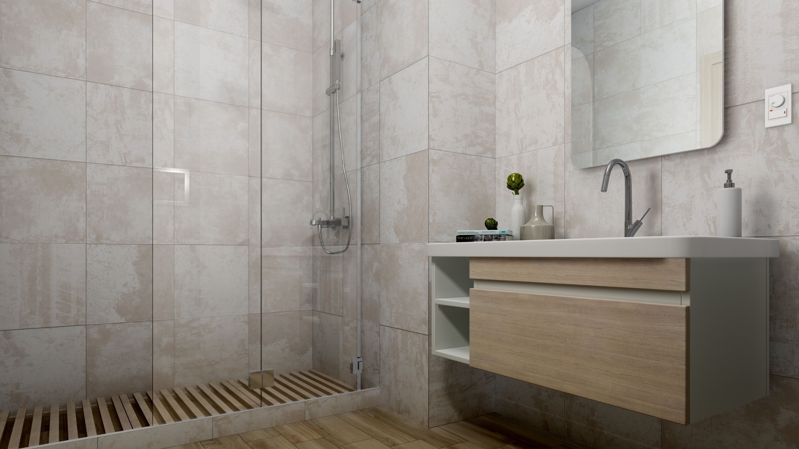 - Широкоформатные плиты также можно выбирать. Но учтите, стены комнаты должны быть идеально ровные. Если это не так, и нужно будет еще дополнительно выравнивать поверхности — это отнимет дополнительное пространство.