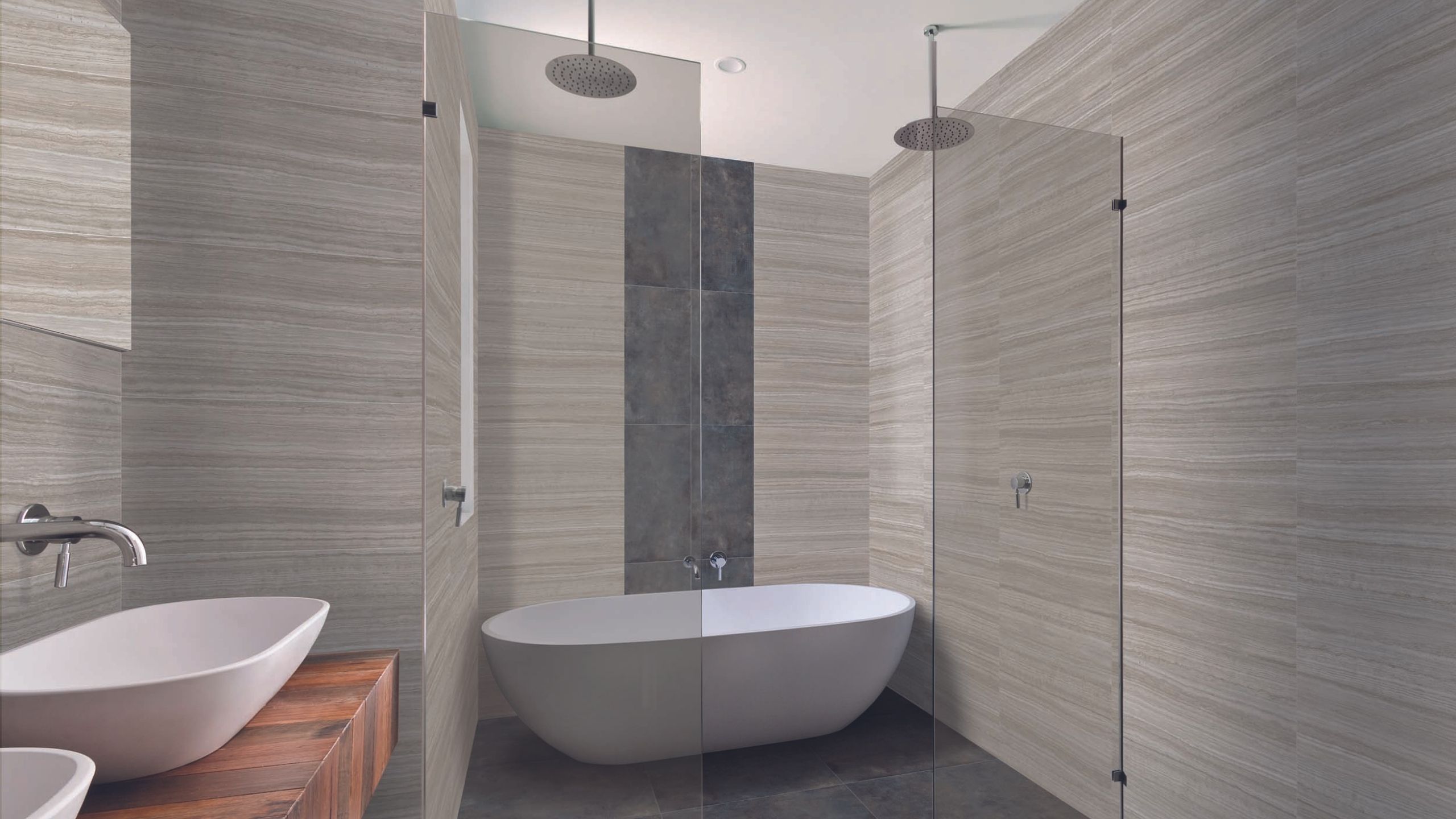 При выборе плитки для маленькой ванной комнаты дизайнеры также рекомендуют обратить внимание на керамогранит, имитирующий природные материалы: