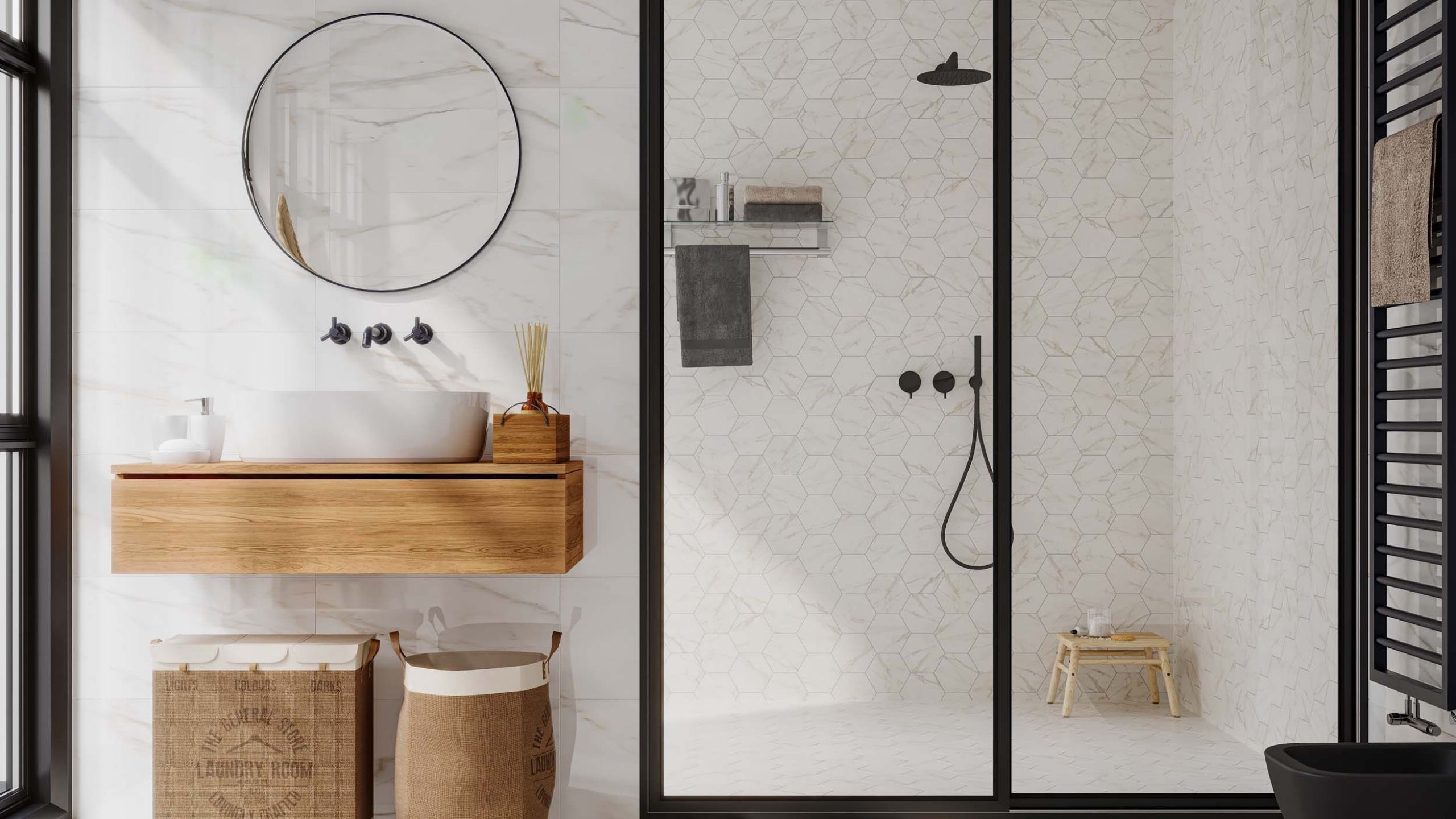 Если же комната узкая и вытянутая, то рисунок из нескольких плит поможет визуально скорректировать геометрию. Плитка с узором также отлично подойдет для создания акцентной стены — например, за умывальником, в зоне душевой или ванны.