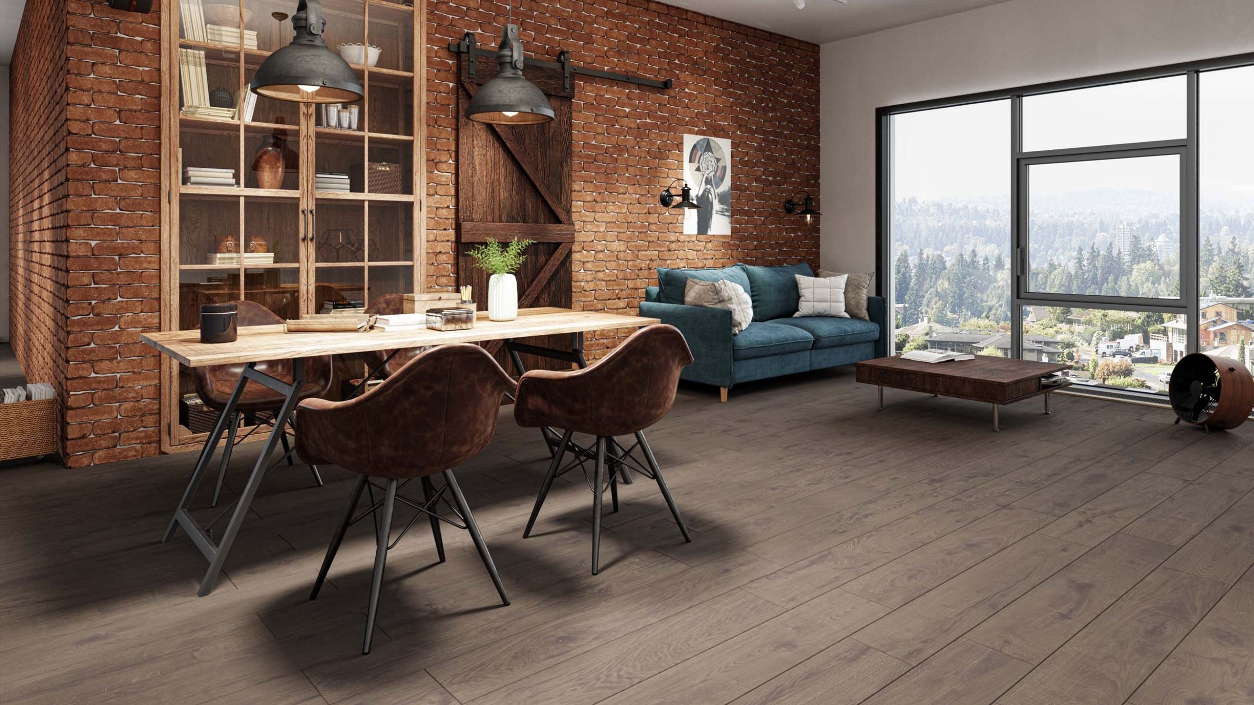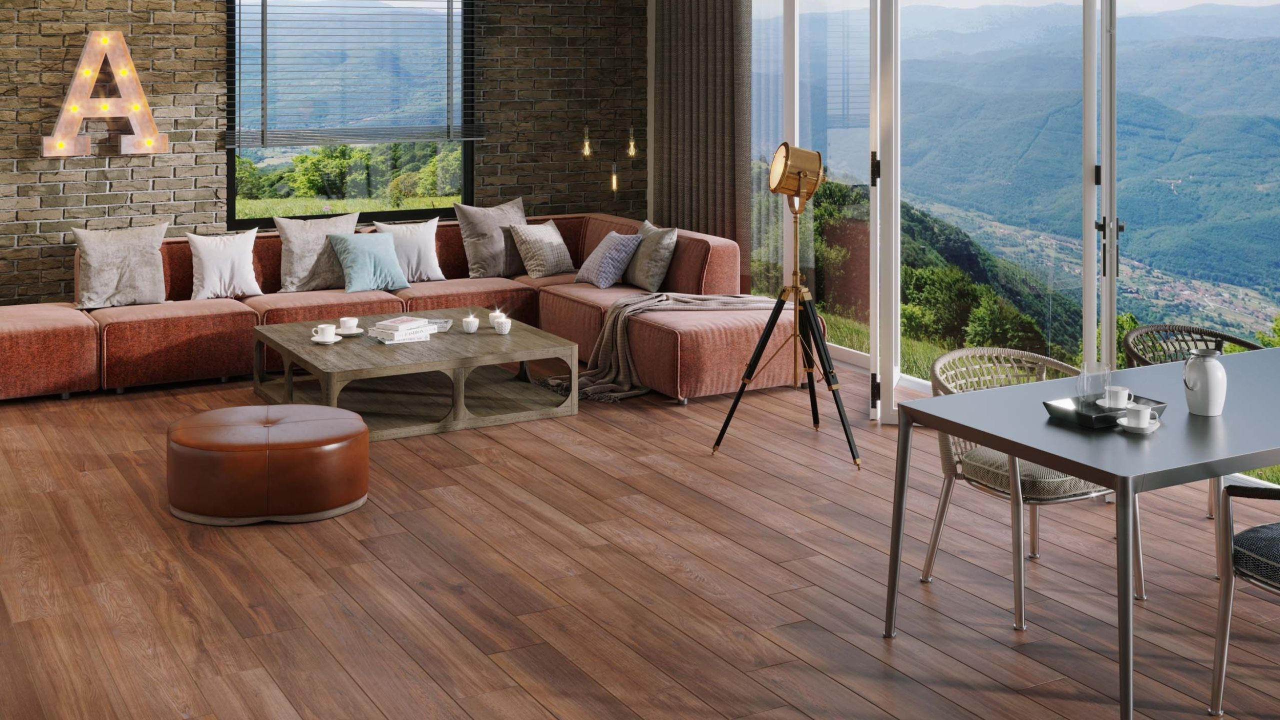 Такая плитка создает в помещении уютную атмосферу. Все то, что природа творила годами и столетиями — трещины, сколы, — воплощается в керамогранитной плитке за несколько минут. Эффект «рустик» позволяет вернуться на несколько веков назад, подчеркнуть изысканный вид интерьера. Так как керамогранит под дерево не боится перепада температур, то может использоваться для внешней отделки объекта.