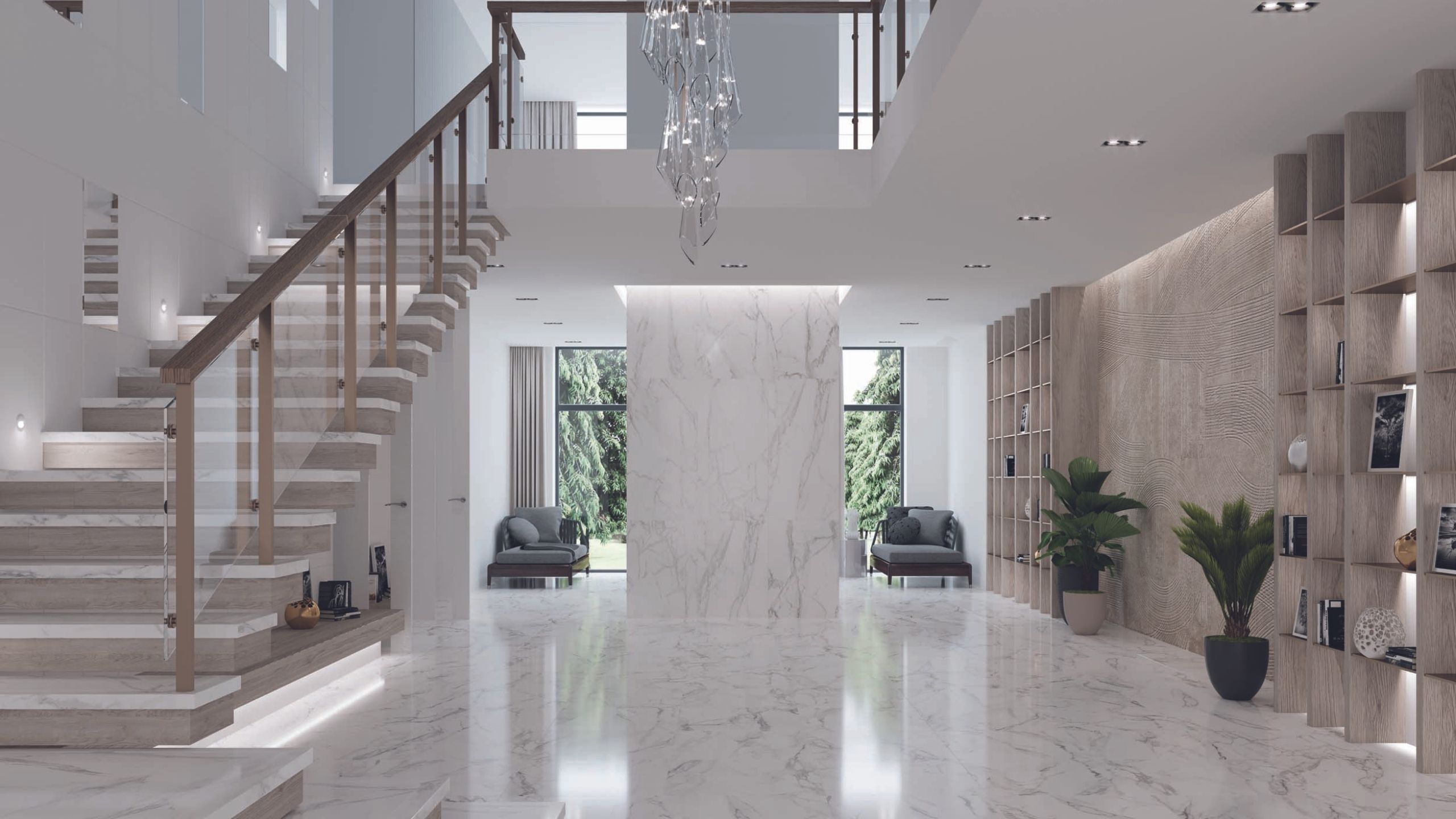 Керамогранит под мрамор с редкими вкраплениями, прожилками, тональными переходами рекомендуем использовать для базовой отделки.