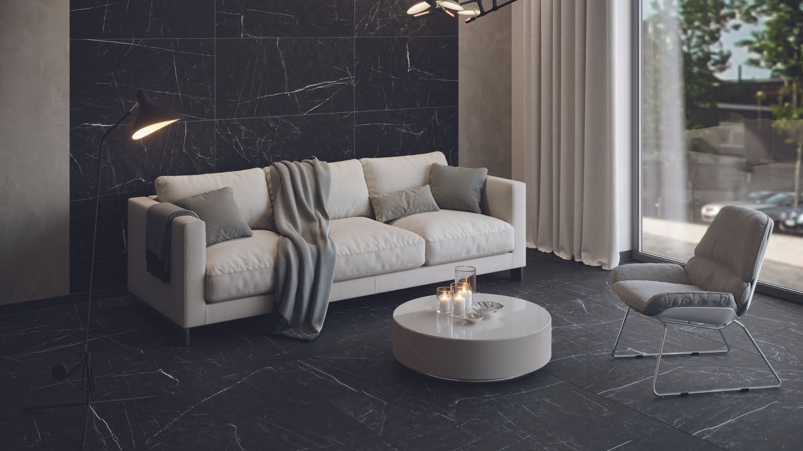 Использовать керамогранит с имитацией черного мрамора нужно дозированно. Хоть такая плитка смотрится красиво и благородно, но избыток черного тона делает помещение темным, визуально уменьшает в размерах. Интересно смотрится черная керамогранитная плитка с белыми «венами», как в коллекции Vision, Marble.
