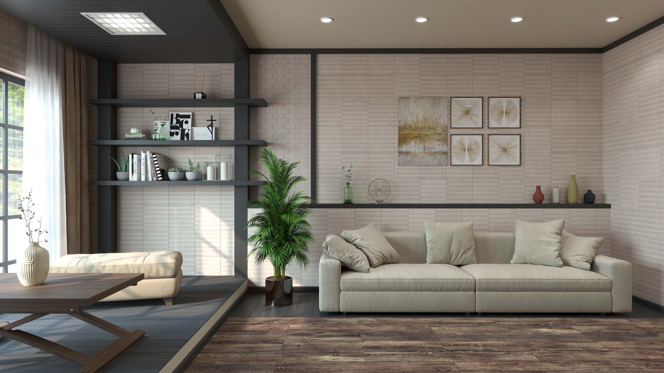 Для гостиной подойдет плитка Classic Wood, которая схожа по рисунку на натуральное дерево. Если вдохновляетесь китайскими горными вершинами и вам хочется добавить акцент в виде каменного пола, то лучше присмотреться к коллекции Kailas из линейки Ametis by Estima. Полностью воссоздает фактуру камня коллекция Tramontana, а оттеняет светлые стены и потолок оригинальный керамогранит из коллекции Terra.