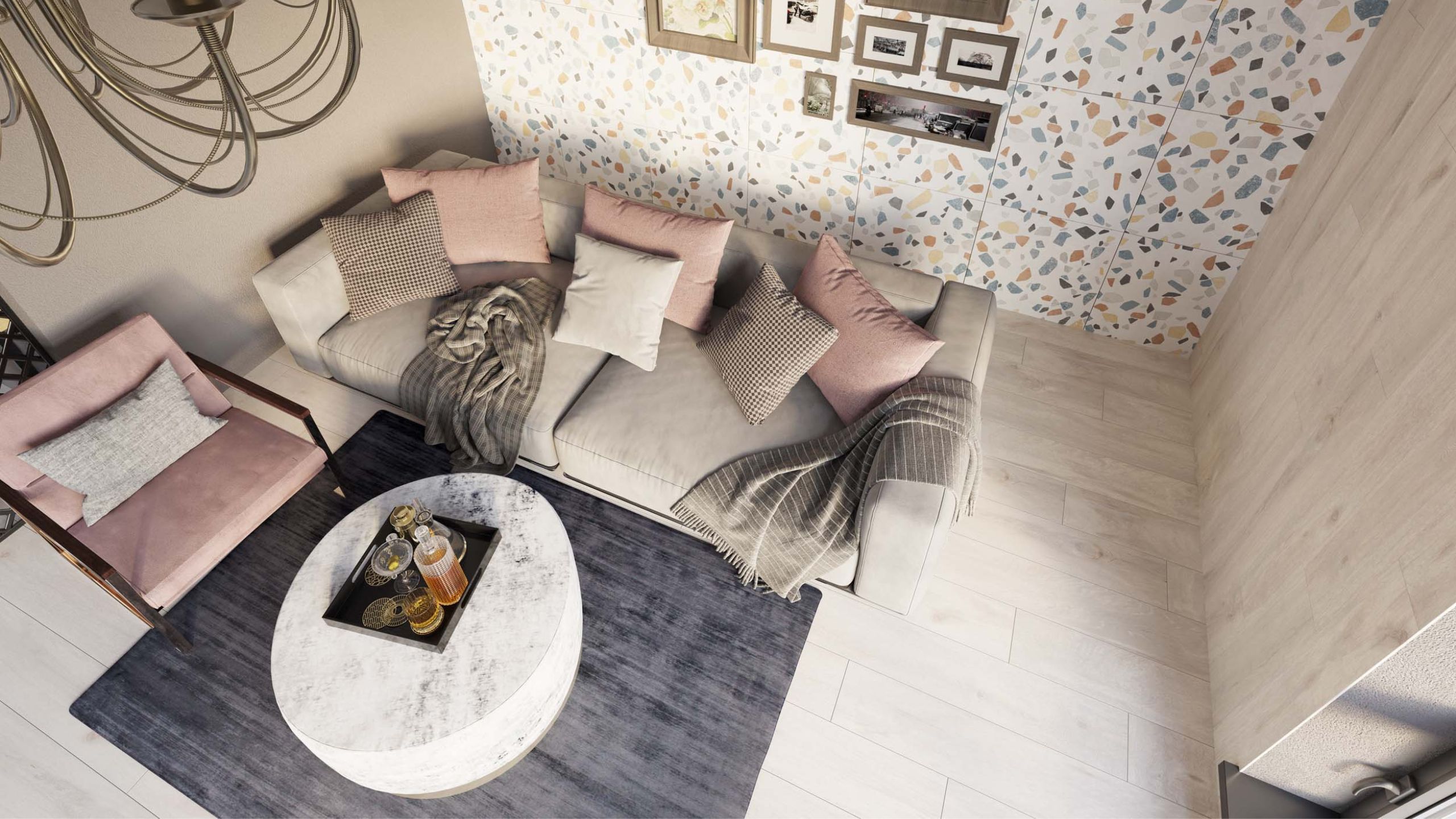 Чтобы интерьер гостиной выглядел гармонично, можно поиграть с оттенками. Правда, чтобы не злоупотреблять ими, используйте до трех цветов плиток.