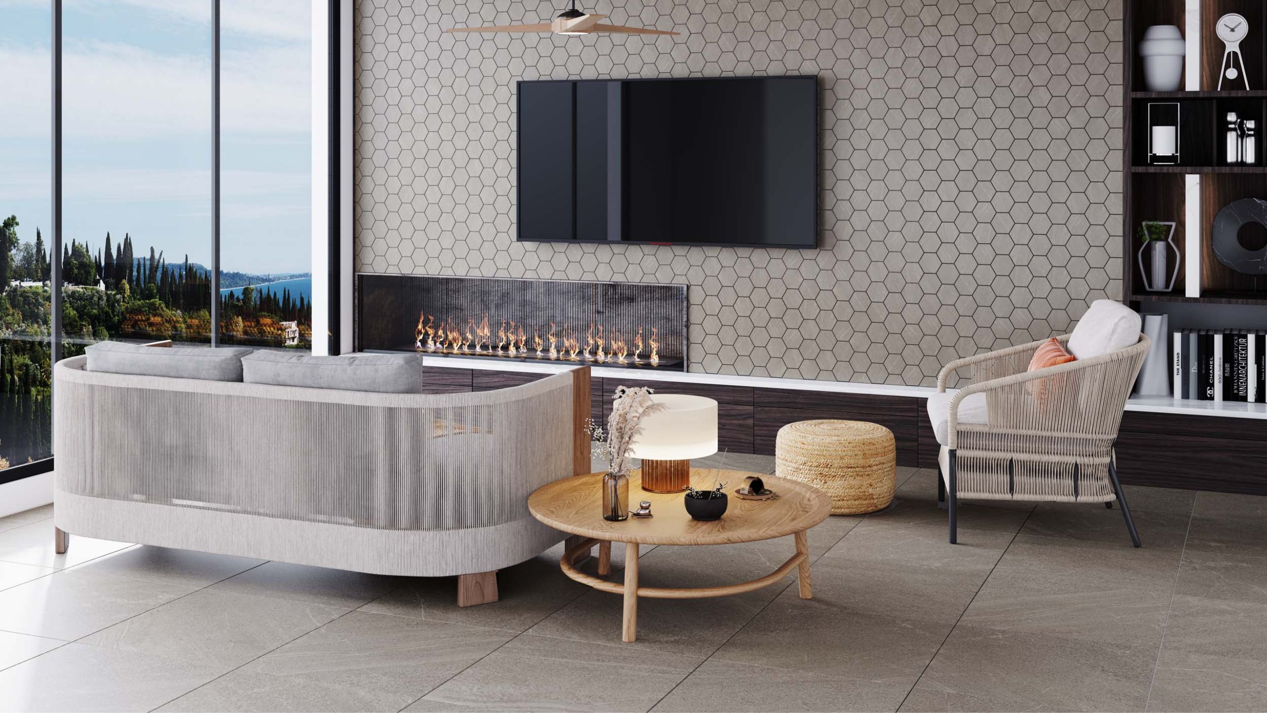 Плитка подходит для оформления гостиной как в классическом, так и в современных стилях. В тренде поверхности в виде камня, древесины, мрамора. Не менее интересно использование плиток под металл, с геометрическим рисунком, узорами или состаренный пэчворк.