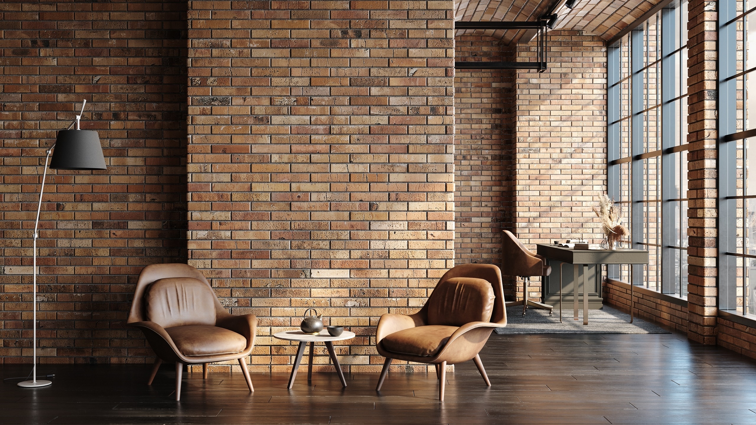 На кирпичную кладку вешают постеры, фотографии, классические или современные картины. Оживить обстановку помогают зеленые растения.