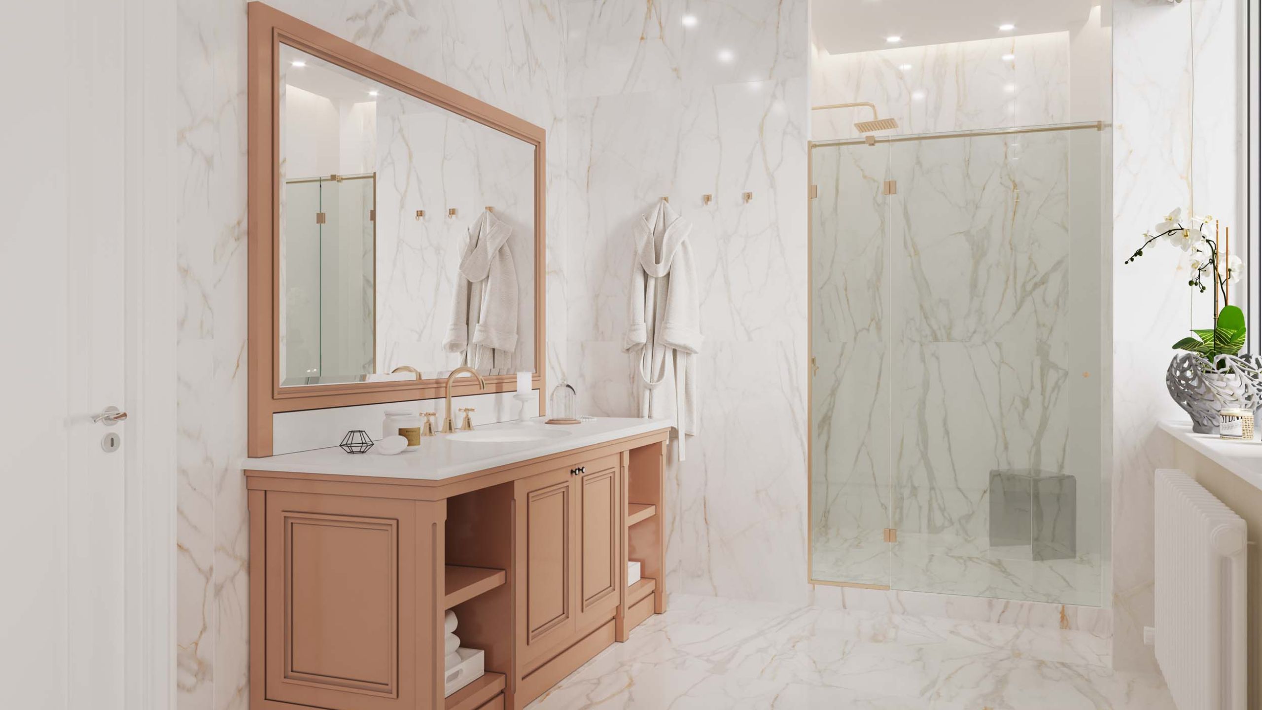 Дизайн присущ статусным особнякам, так как его визитная карточка — использование натурального камня. Для украшения часто выбирают мраморные статуи. Но реализовать стиль можно и в небольших ванных комнатах за счет укладки на стены и пол керамогранита под мрамор. Ведь он идеально повторяет структуру камня, создает неповторимые узоры и расцветки.