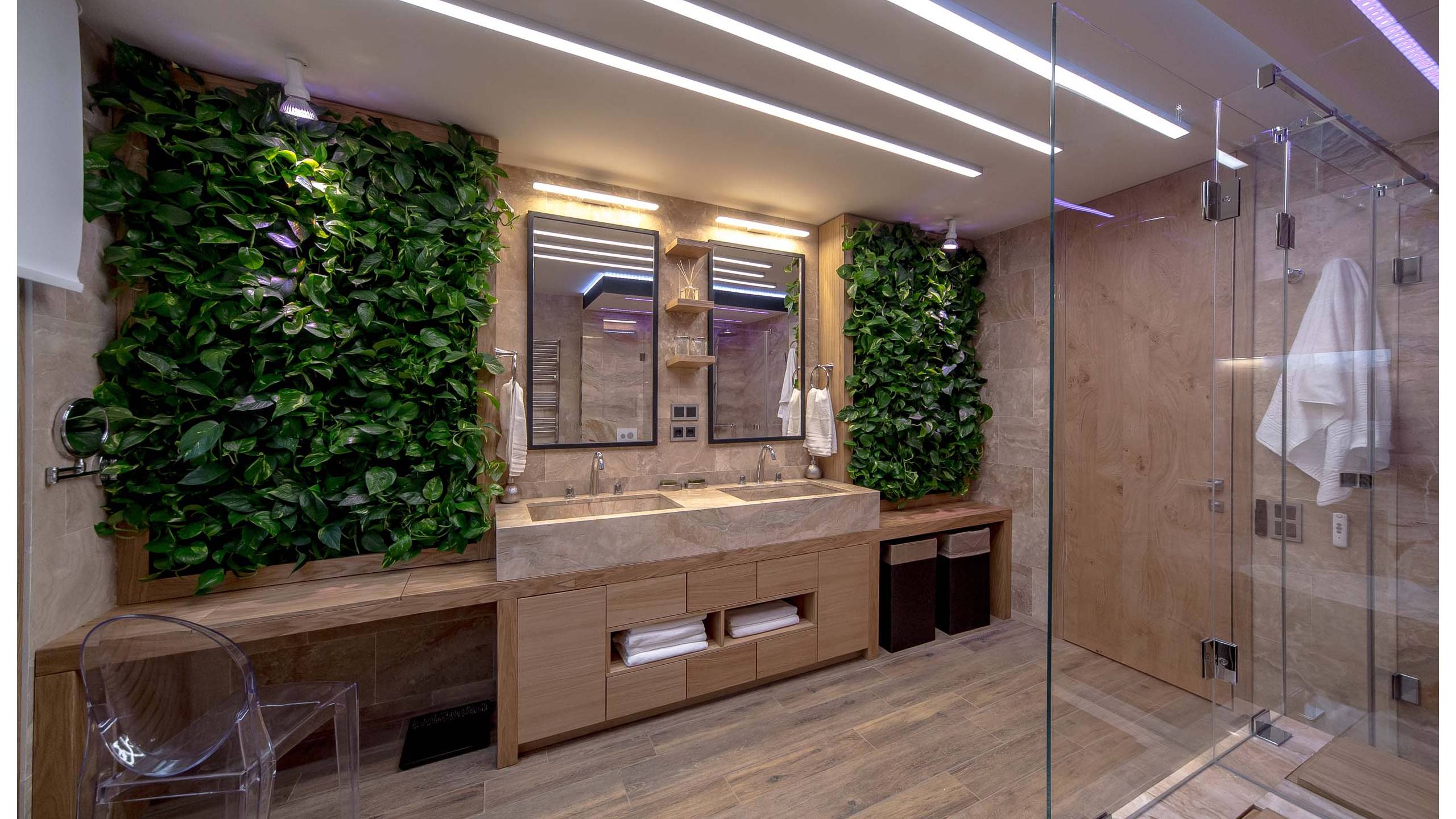 Для обрамления стиля комнаты подойдут настенные светильники, бра, точечные светодиодные светильники, домашние прожекторы, подвесные люстры. В просторных ванных создают дополнительную подсветку отдельных зон, например, душевой и зеркал.