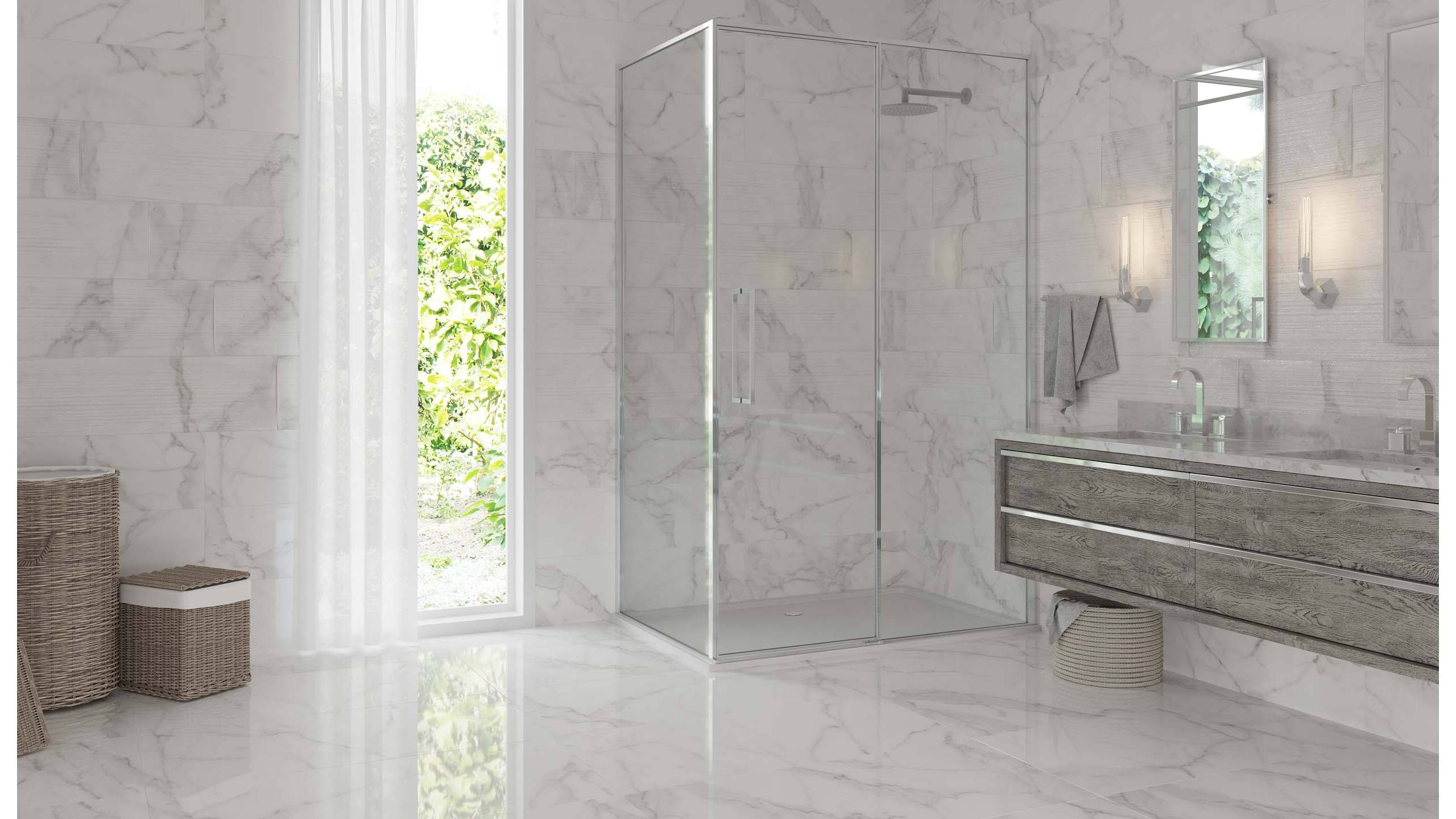 В интерьере выигрышно смотрится керамогранит Estima. Материал имитирует мрамор, паркет, состаренное дерево, яркую керамическую плитку. Ниже будут рассмотрены варианты оформления ванной комнаты с применением коллекций Estima.
