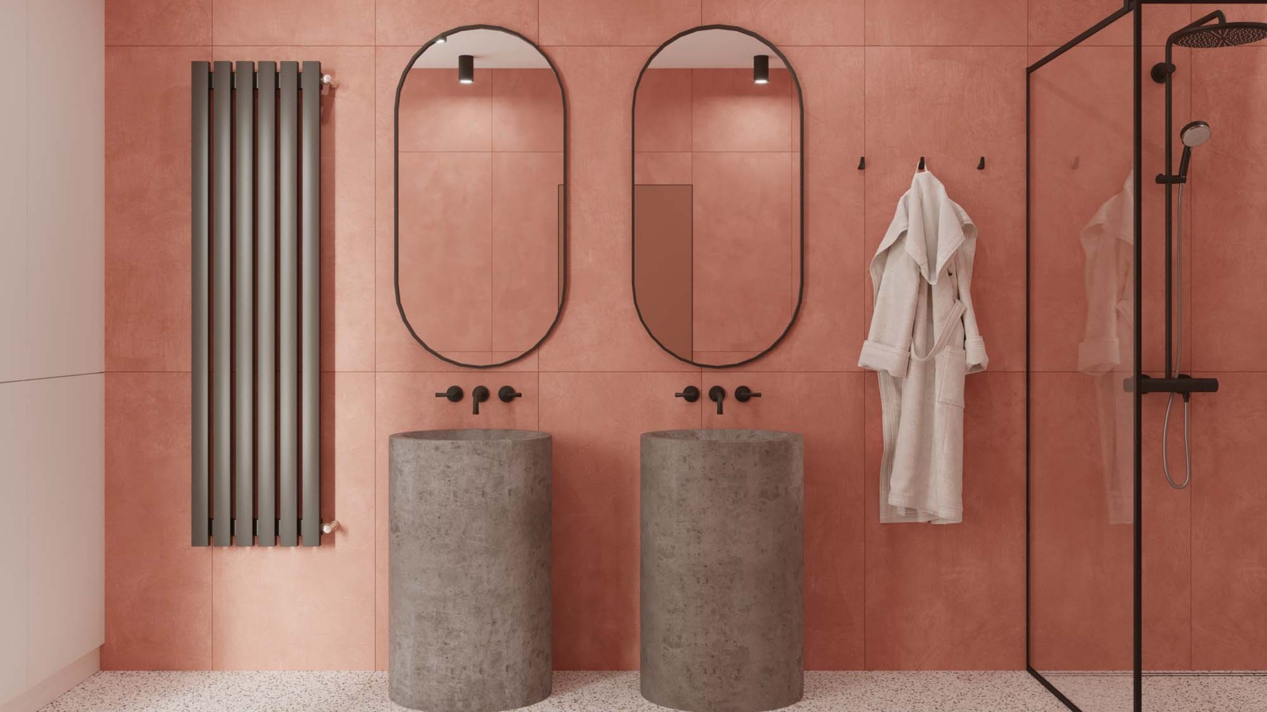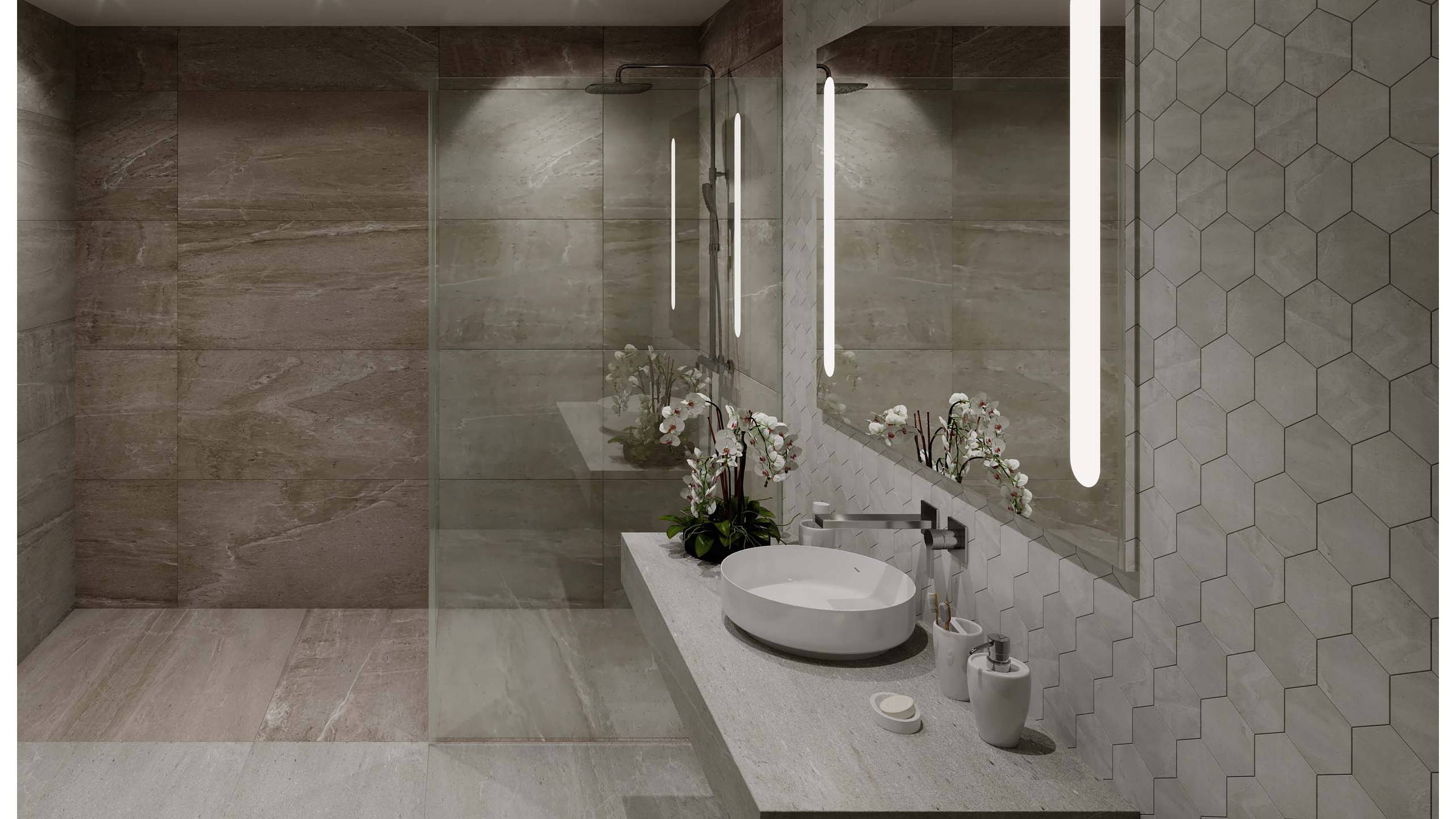 Ванную относят к мокрым помещениям. Поэтому для повышения уровня безопасности подбирают нескользкий и быстросохнущий материал, каким является керамический гранит. Он уместен для оформления пола в нашем стиле. Вот несколько вариантов с применением керамогранита Estima: