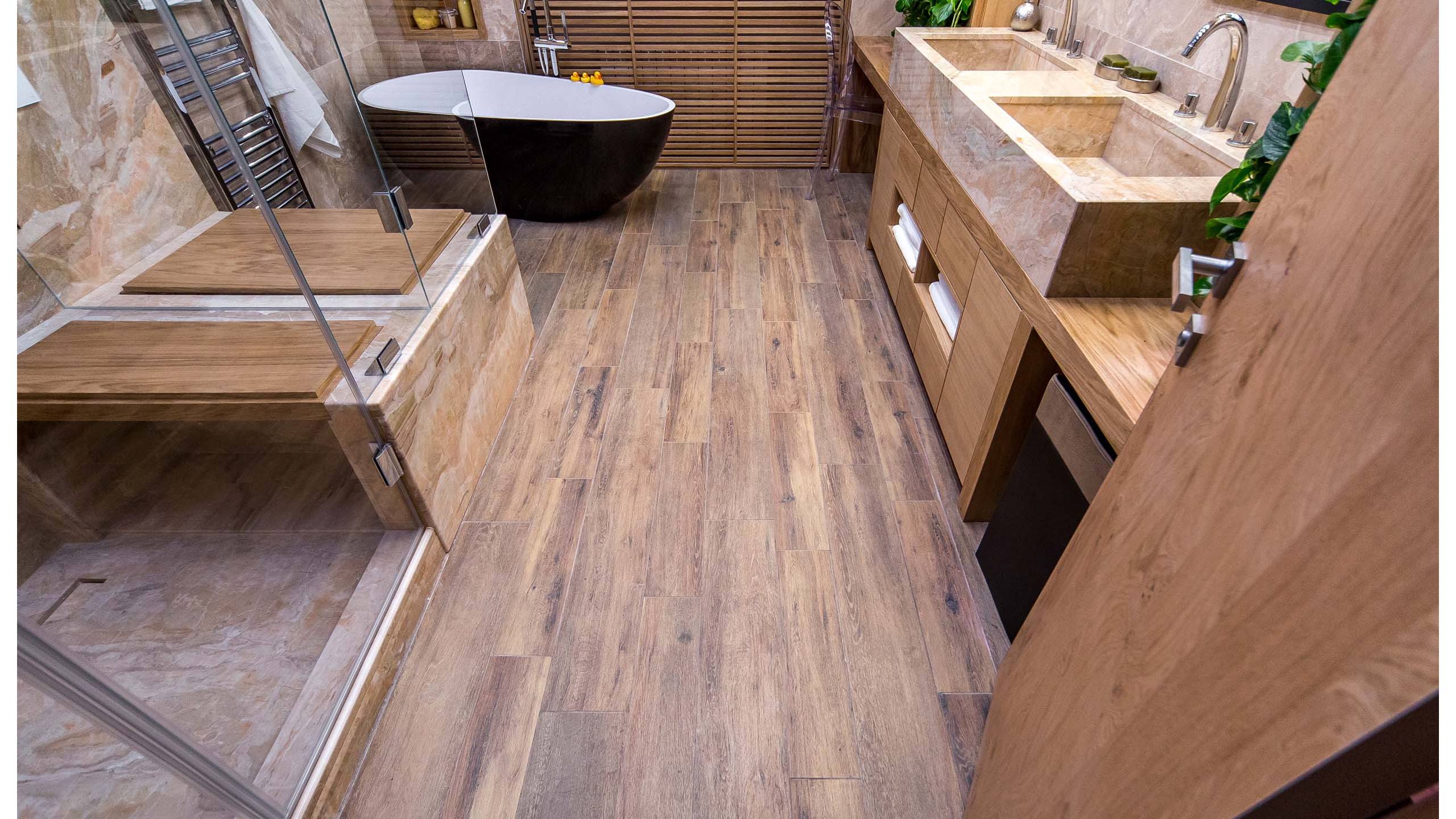 - В общем дизайне ванной хорошо смотрится темный пол. Его можно оформить с помощью керамогранита из коллекции Brigantina. Поскольку стилю соответствует натуральность, уместной будет имитация состаренного дерева. Еще материал подходит для оформления зоны под ванну или душ.