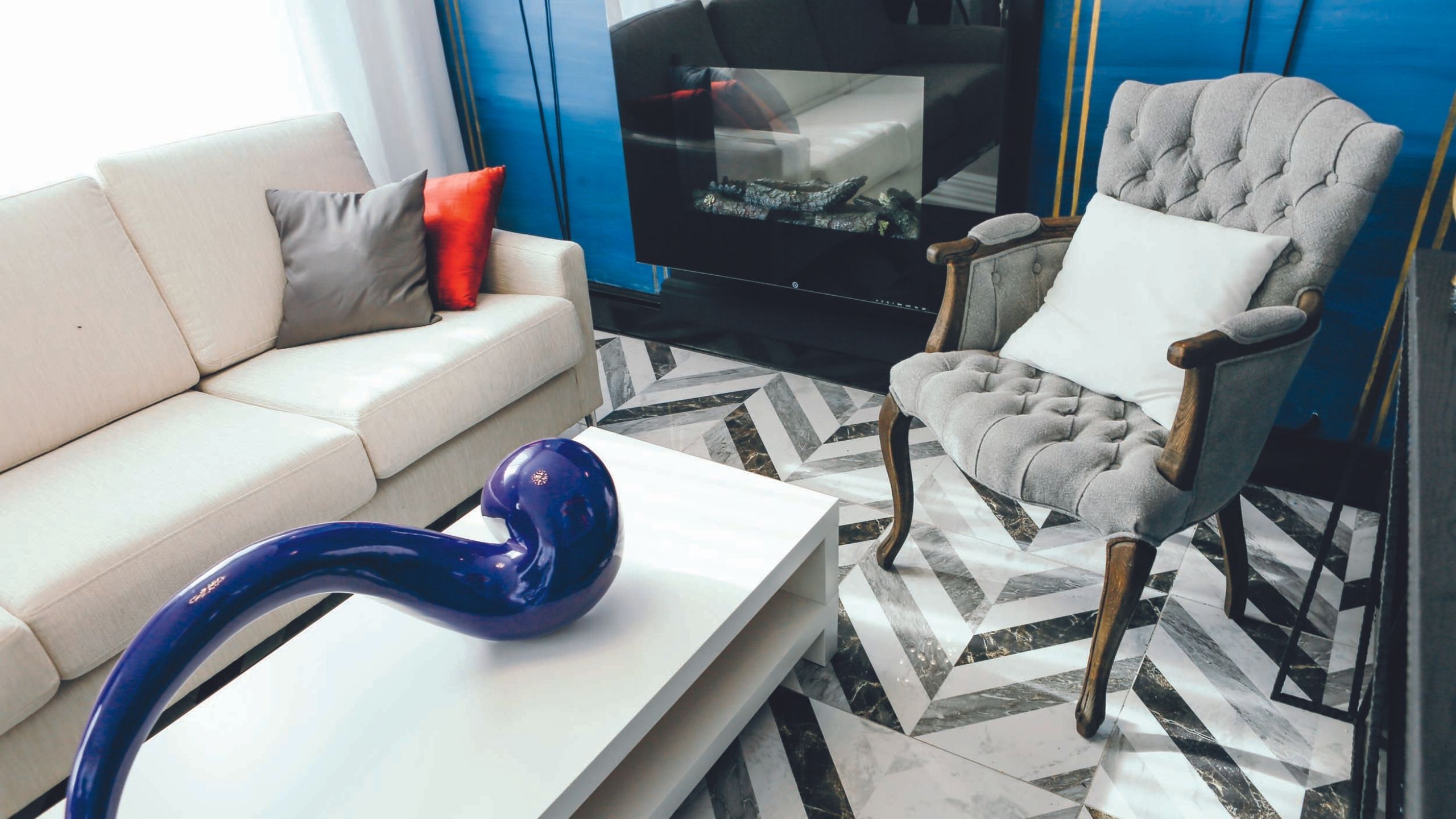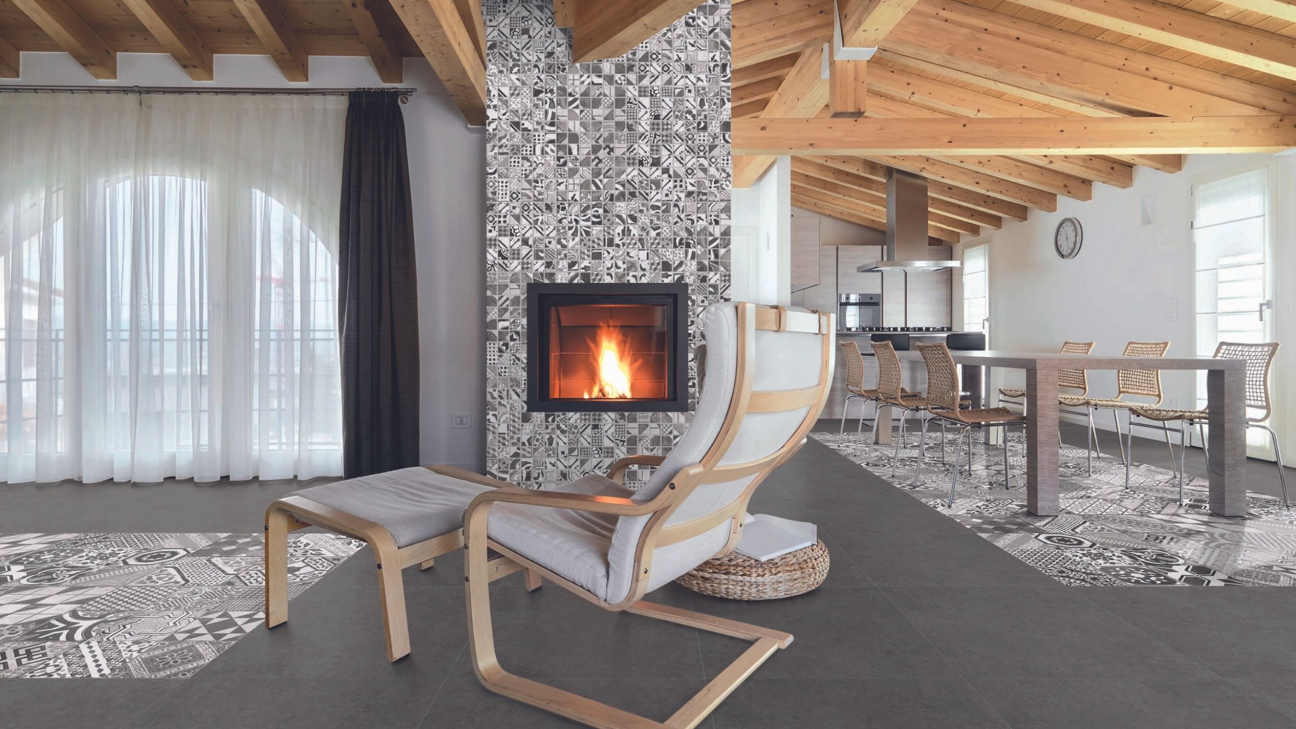 Плитка пэчворк — это материал, который не боится экспериментов. Например, в просторной гостиной часть пола делают из одноцветного керамогранита, а часть — выкладывают в виде ковра. Кроме этого, такой материал используют для облицовки стен и каминов.